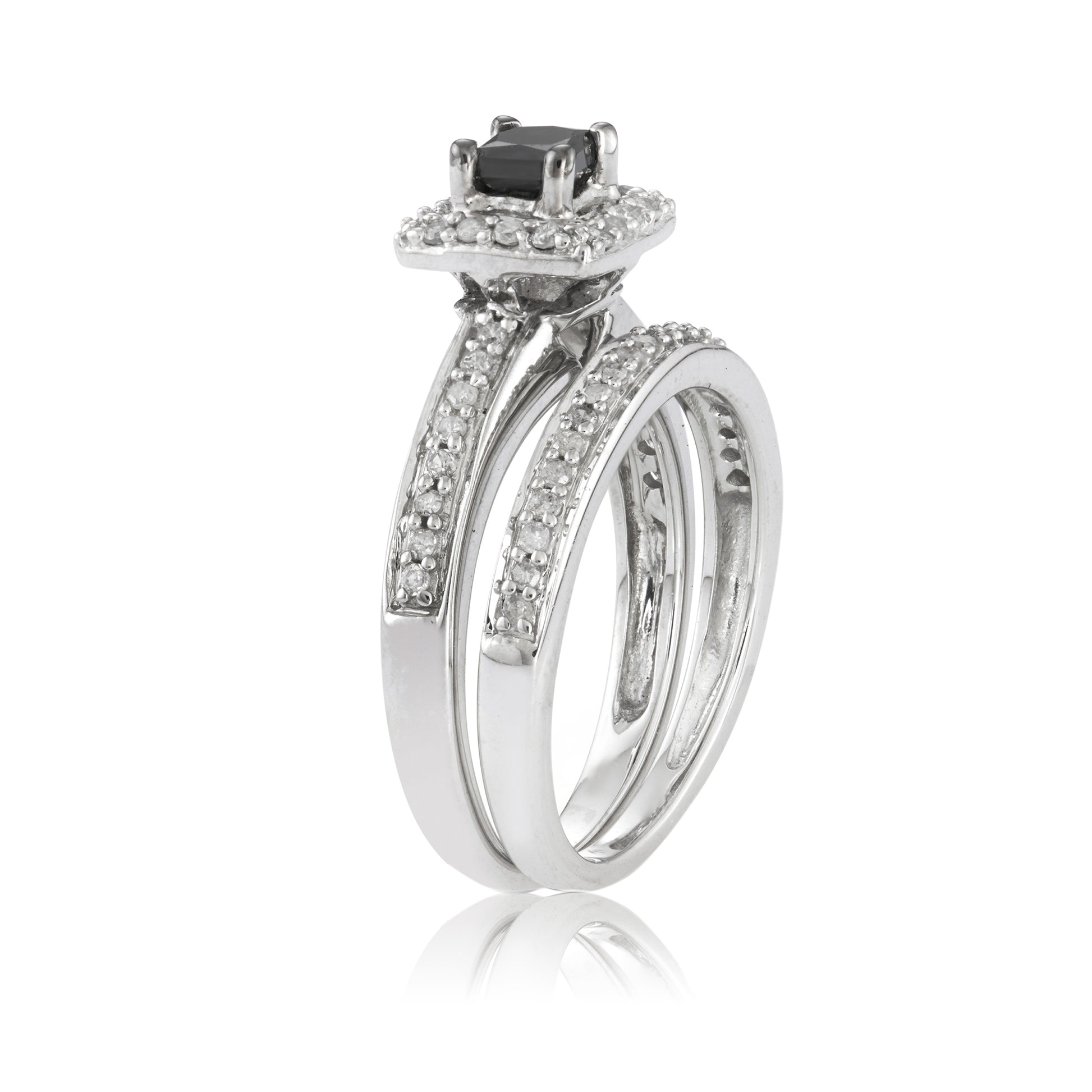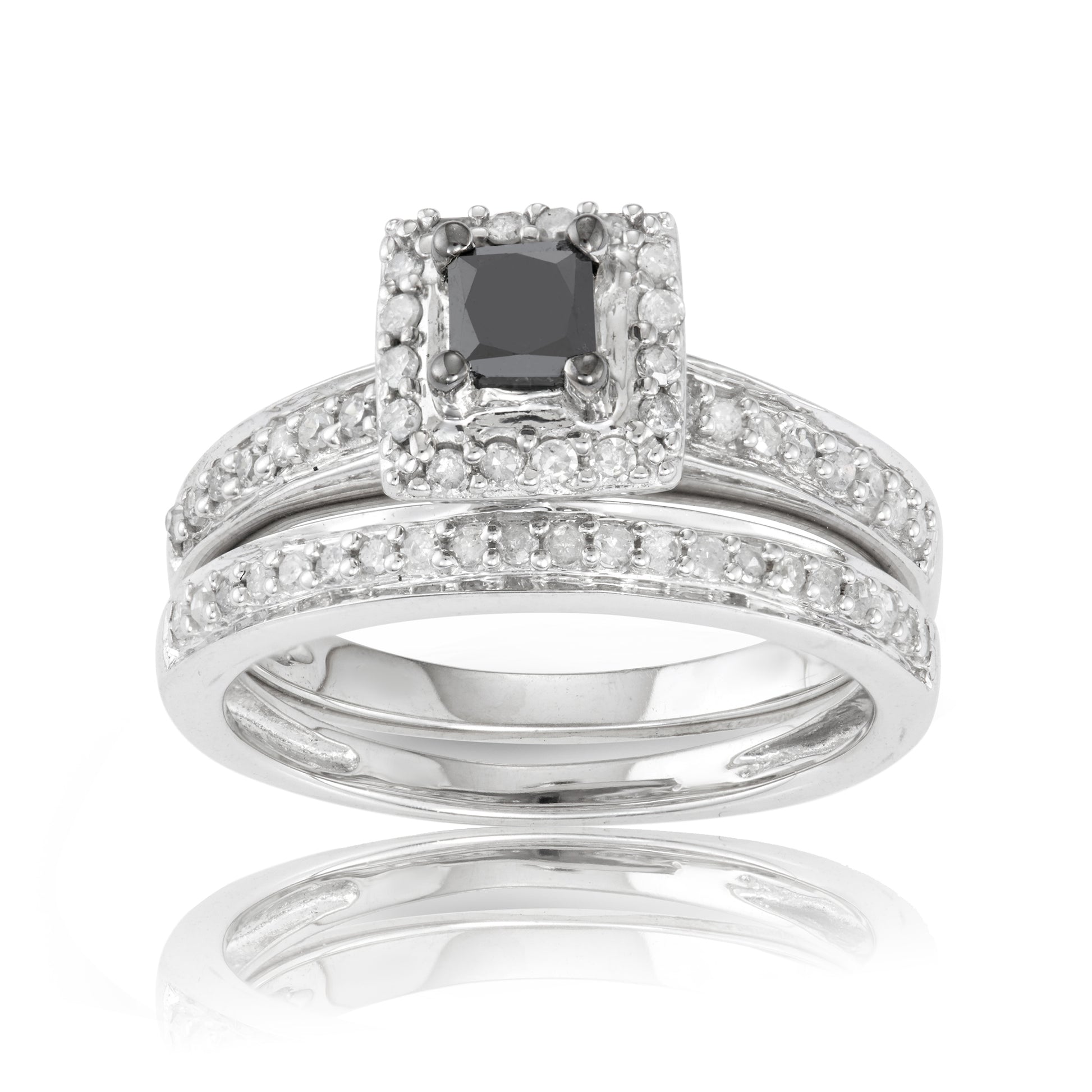 Crafted of 10-karat white gold, this bridal set features 0.50 carats TDW. The engagement ring is decorated with a square-cut black diamond and accentuated with a halo of round-cut white diamonds. Additional diamonds flank either side of the center stone on the band. The matching wedding ring features a single row of round-cut white diamonds in a pave-setting. The engagement and wedding ring set is available in sizes 5 through 9.Crafted of 10k White Gold