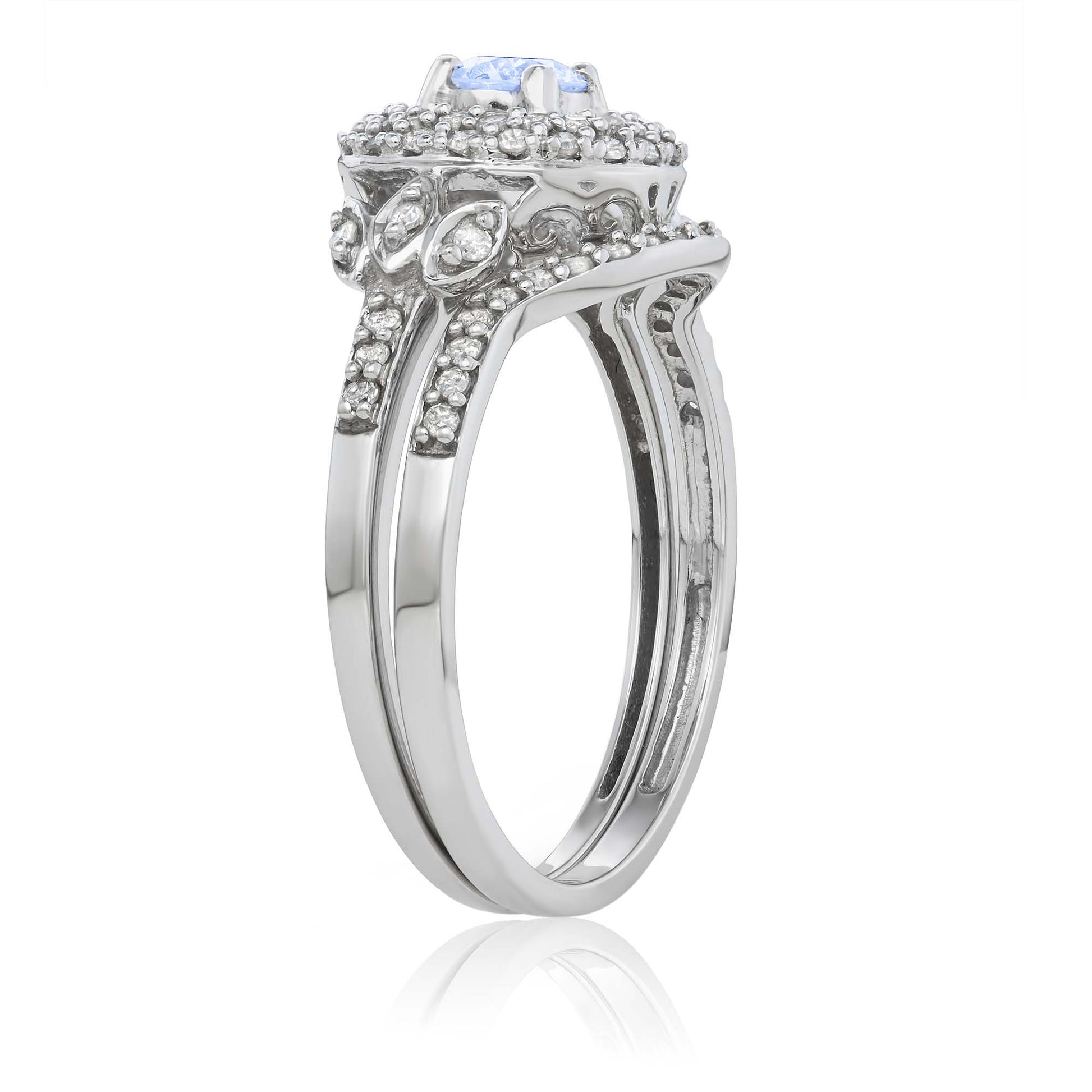 Crafted of crisp white 10-karat white gold, this beautiful round shaped bridal set features a beautiful double halo designed engagement ring and a matching curved wedding band. The engagement ring features a round-cut soft blue Tanzanite weighing 0.25 carat TGW. It is surrounded by 0.26 ct TDW of round-cut white diamonds decorating the double halo and each side of the band. A matching curved wedding band features 0.10 carat TDW of round-cut white diamonds to complete the set. This ring is available in sizes 5 through 9.Crafted of Gold