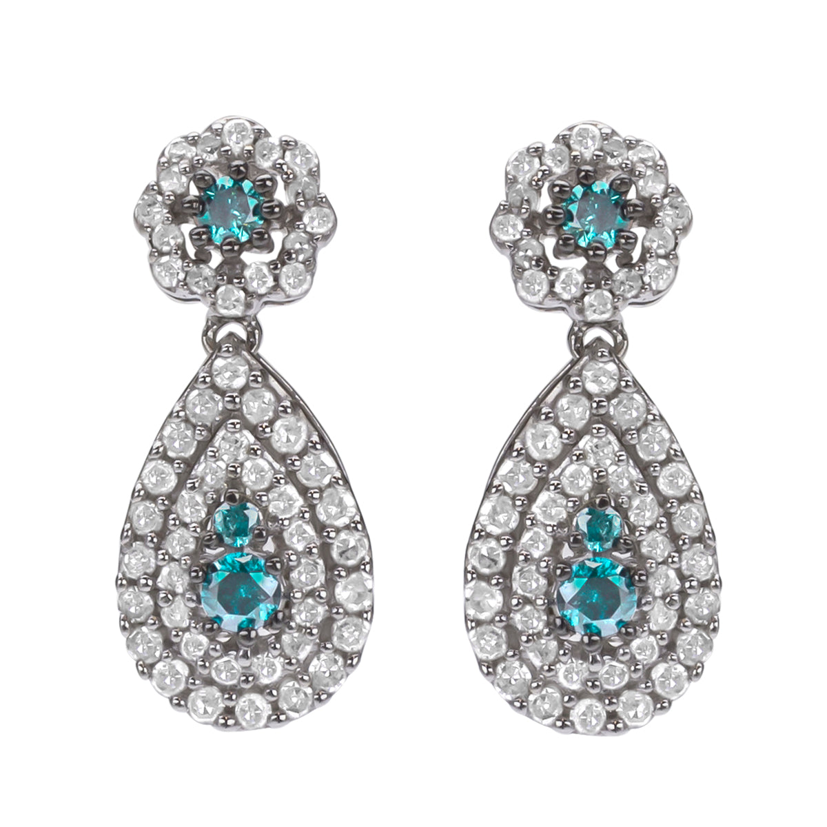 Designed in 10-karat white gold, this gorgeous pair of elegant white and blue diamond earrings offer glamour at a fraction of the price. The drop earrings feature a gorgeous floral shaped halo of white diamonds surrounding a blue diamond in the center. A pear shape features two rows of white diamonds surrounding 2 blue diamonds in the center suspending from the floral halo. These dangling ladies earrings secure with a post and friction back closure. Crafted of 10K White Gold