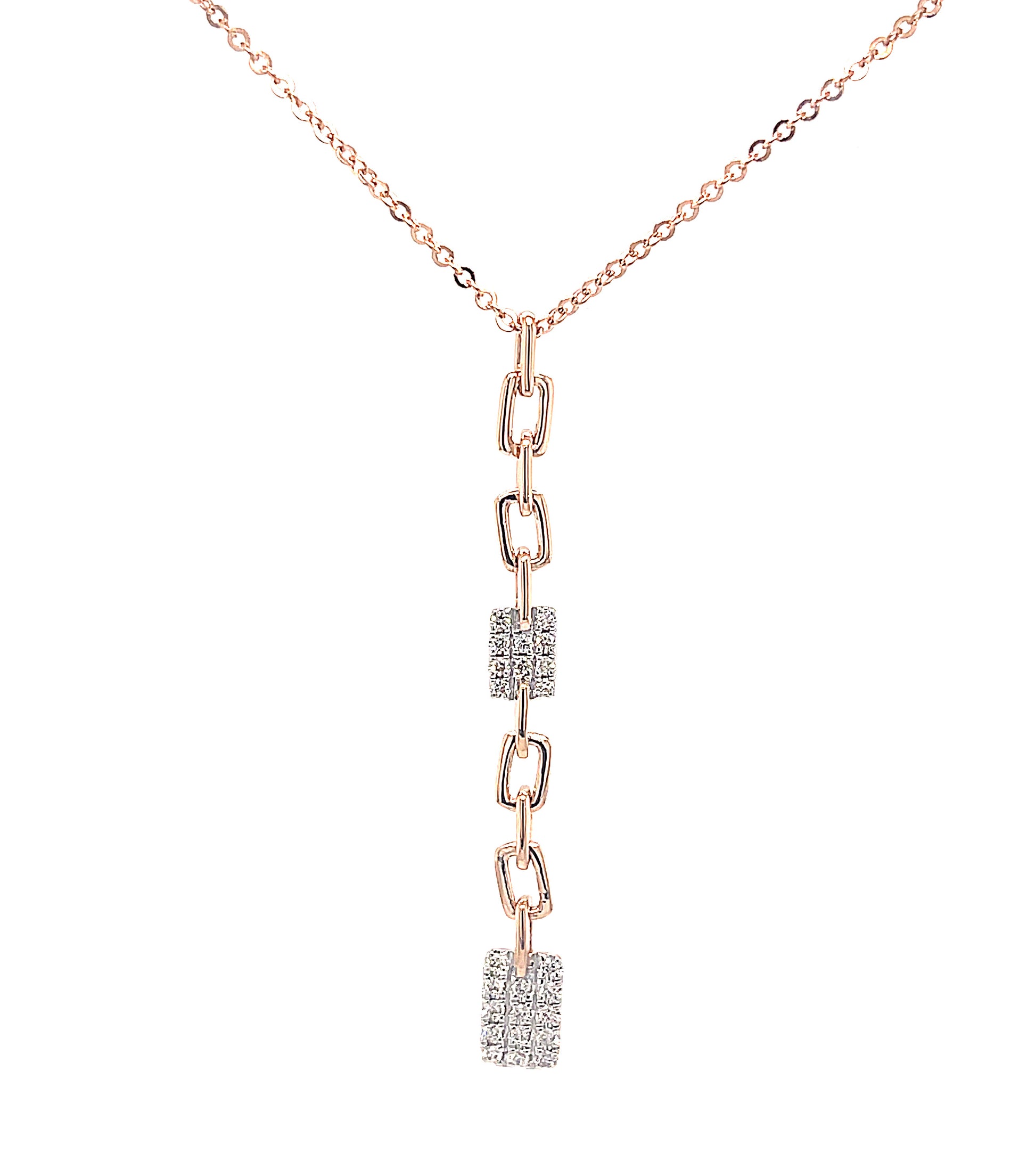 This unique and spectacularly crafted necklace is crafted of 14-karat rose gold. The adjustable 18 inch chain features a long pendant created with square links alternating with diamond decorated square links. This unique pendant features near colorless white diamonds weighing 0.17 carat TDW. This necklace is beautiful in its unique yet simplistic design and would be a gorgeous addition to any woman's jewelry collection.