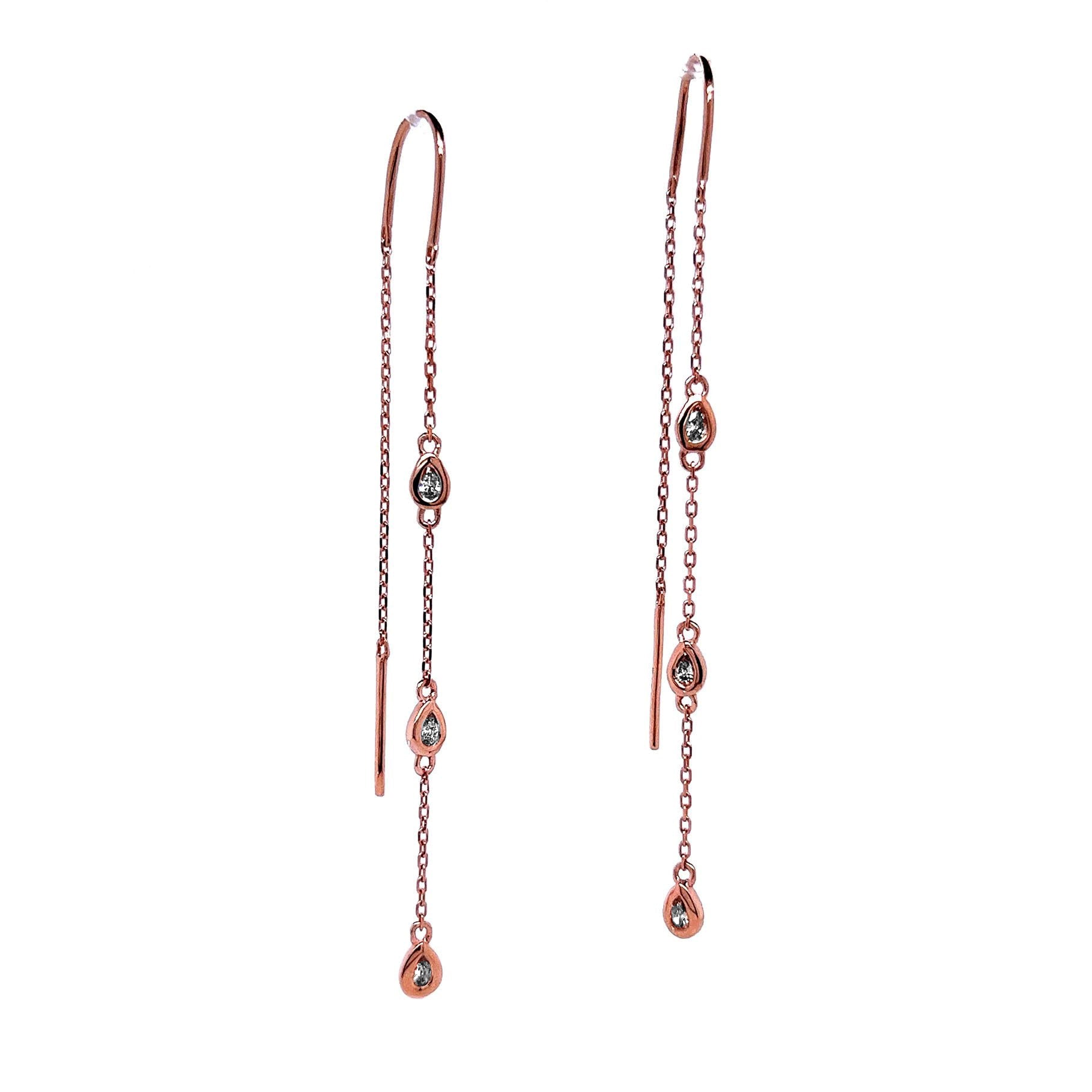 Crafted of 14 karat rose gold, these dangling threader earrings feature 6 pear-cut white diamonds in a bezel setting. The diamonds are interspaced between lengths of chain to create a spectacular and dazzling look. The earrings measure 2.5 inches long and have a curved threader bar to sit securely in your ear.