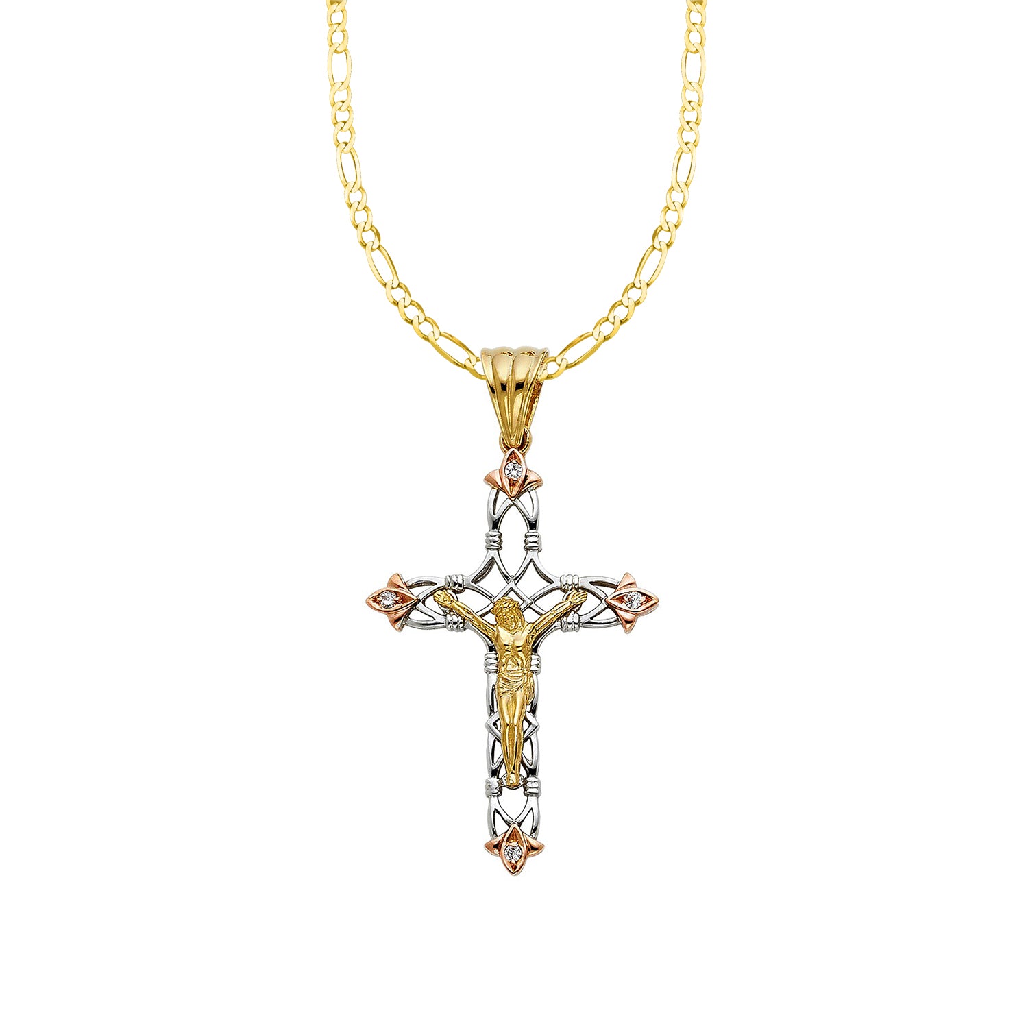 This tri-color 14-karat gold crucifix pendant features an ornate white gold cross with rose gold floral accents and round-cut cubic zirconia at each end. In the center rests a yellow gold figure of Christ. The pendant measures 1.88 inches long.The pendant is completed with a matching 14k yellow gold 2.3-mm Figaro chain in your choice of 16 inches to 24 inches long.