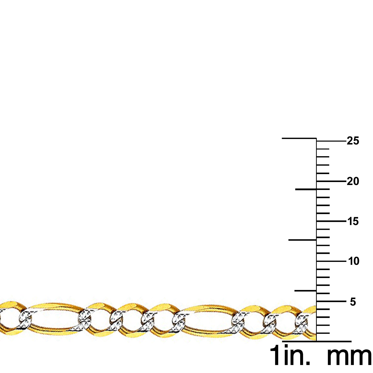 Designed in genuine 14-karat yellow gold, this Figaro chain features a 3 round links and 1 elongated link design. Each link features an open shape and a white pave' design for added sparkling shine. This Figaro chain measures 4.7 mm wide, making this a perfect size for men's wear. The necklace is available in 22, 24 and 26 inches long and secures in a lobster claw clasp.Crafted of 14k Two-tone gold