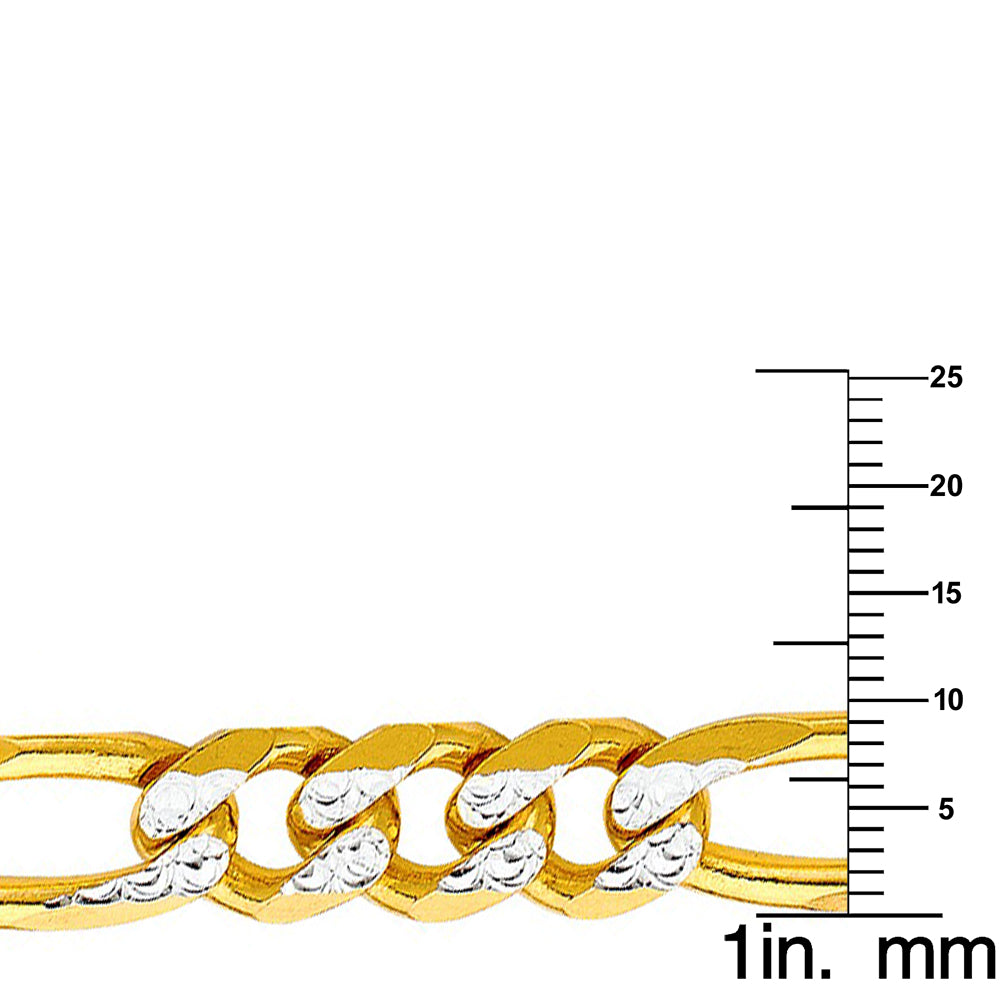 Designed in genuine 14-karat yellow gold, this Figaro chain features a 3 round links and 1 elongated link design. Each link features a white pave' design for added sparkling design. This Figaro chain measures 9.5 mm wide, making this a perfect size for men's wear. The necklace is available in 24 and 26 inches long and secures in a lobster claw clasp.Crafted of 14k Two-tone gold