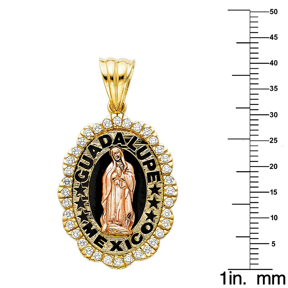 Dazzling with round-cut cubic zirconia, this 14-karat yellow gold pendant has a rose gold image of Guadalupe in the center of a black enamel base. The large pendant measures 1.25 inches long and is the perfect style for the devoted.