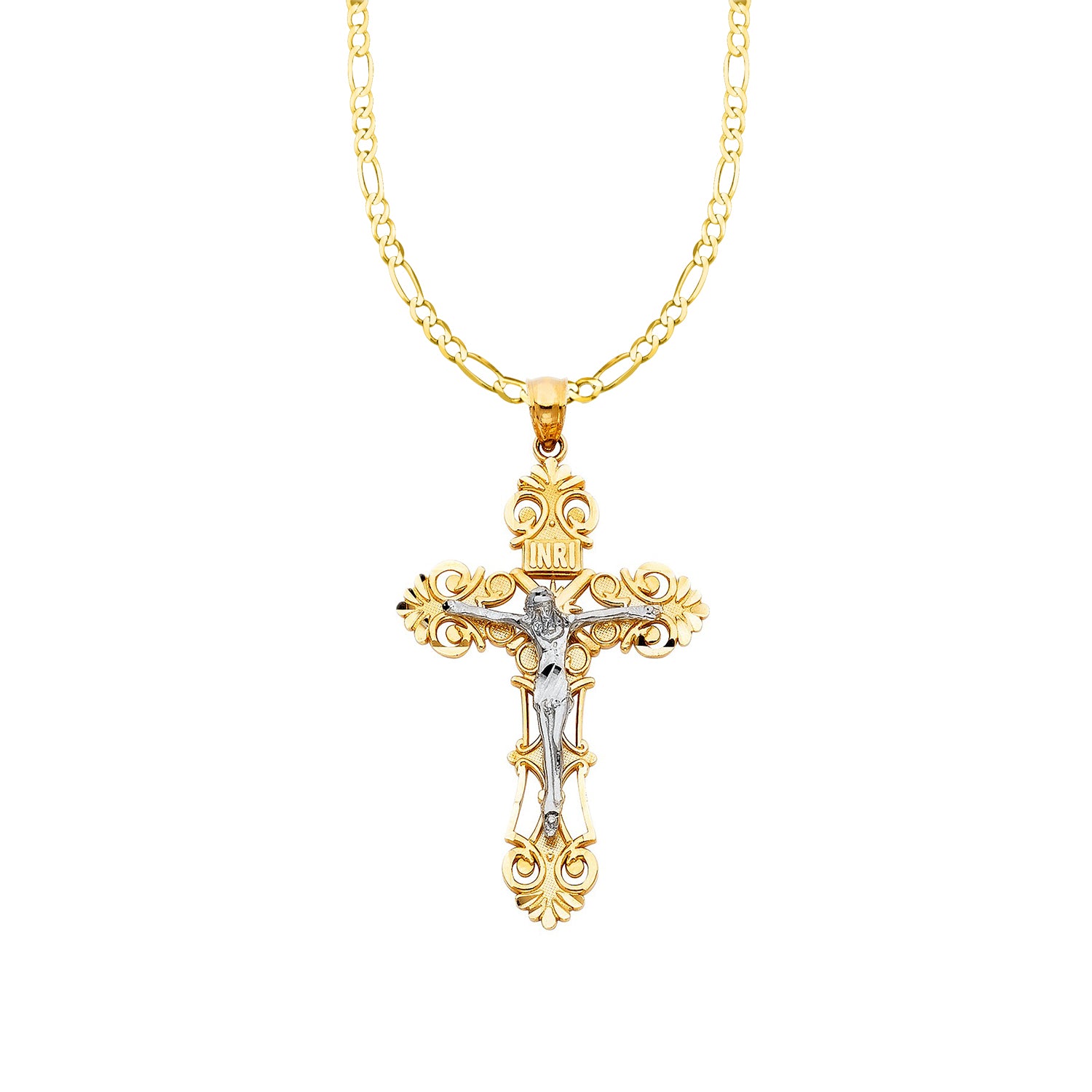 14k Two-tone Gold Fancy Crucifix Cross Pendant with 2.3mm Figaro Chain