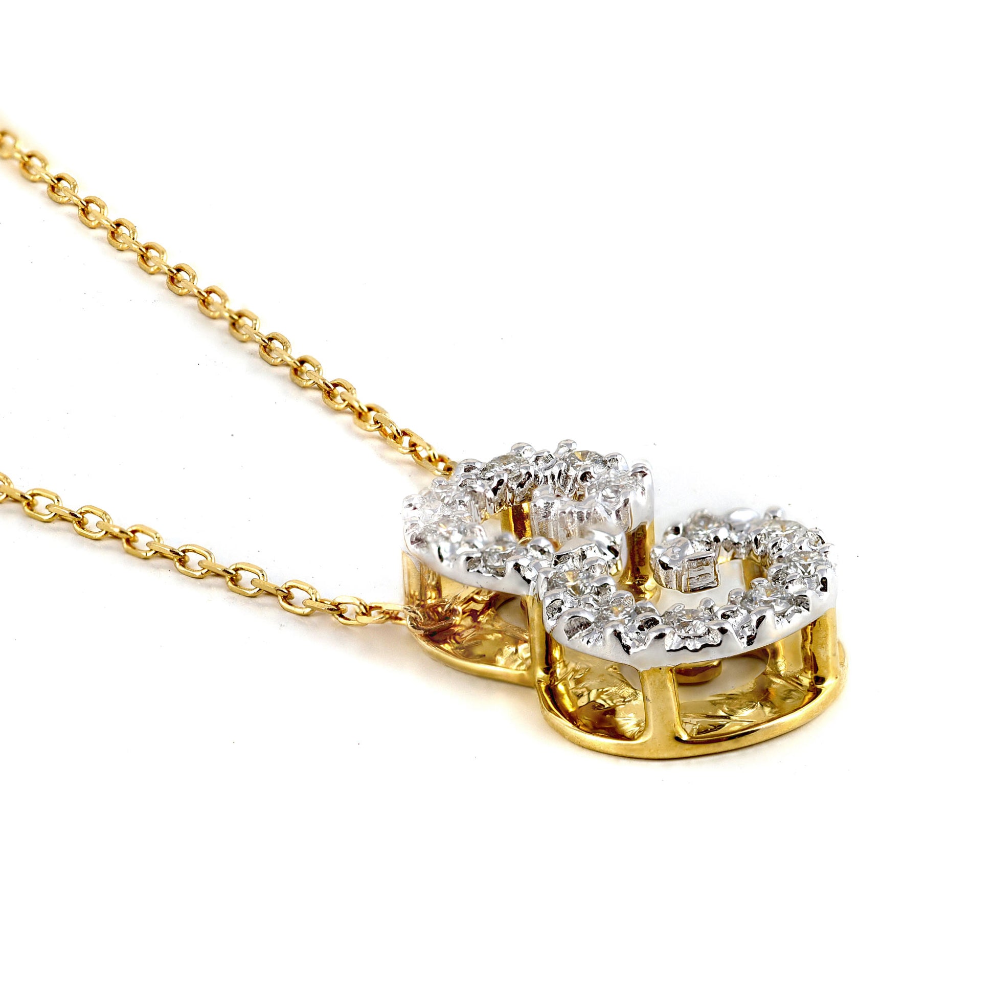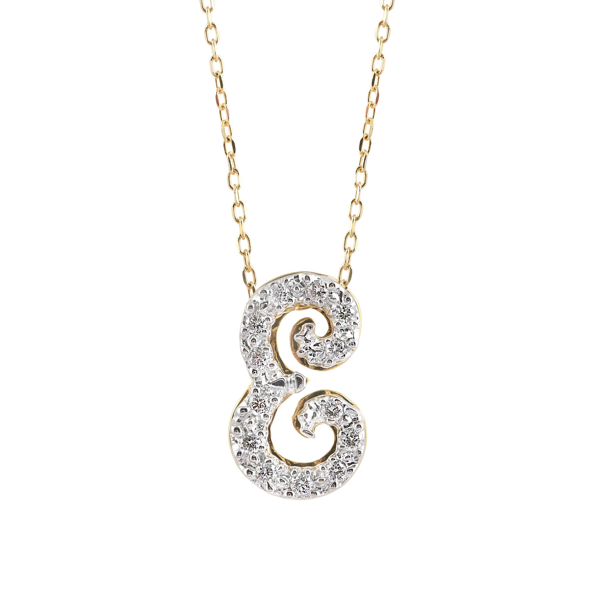 Crafted of 14-karat yellow gold with white gold accents, this lovely intial pendant features a beautiful script letter 'E'. The pendant is lined with 0.14 carat TDW round-cut white diamonds to add extra dazzle to the design. The necklace is accompanied with a matching 18 inch chain and secures with a spring ring clasp.