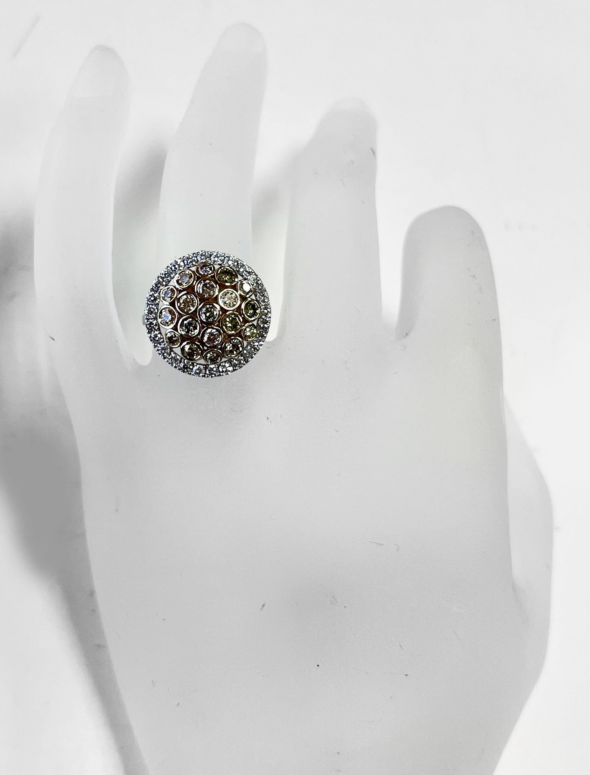 Our dazzling Fancy Multicolor and White Diamond Cluster ring is fit for royalty. A large richly colored round cluster of 19 fancy multicolored yellow, champagne and brown diamonds in bezel settings are encircled by 26 round-cut white diamonds which create a halo around this boldly designed ring.