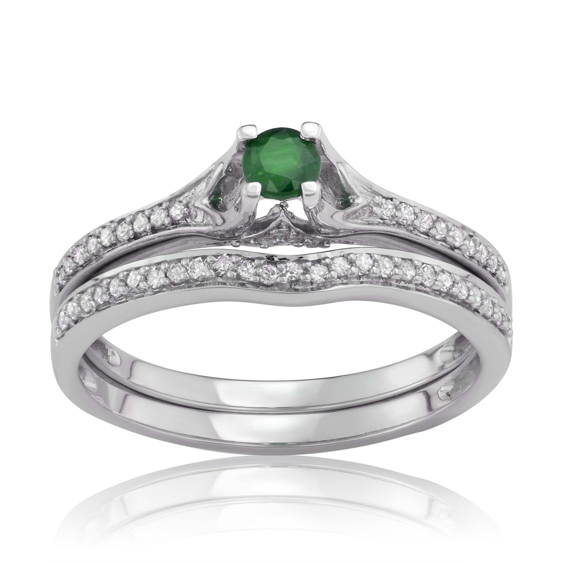 Designed in 14-karat white gold, this gemstone bridal set features a simply classic design. A round-cut bright green emerald weighing 0.25 carat rests in the center of a cathedral setting the engagement ring. The band is lined with an additional 0.15 carat TDW white diamonds to complete the classic look. A matching wedding band that curves to fit the engagement ring design features 0.14 carat TDW of round-cut white diamonds. This bridal set is available in sizes 5 through 9.Crafted of Gold