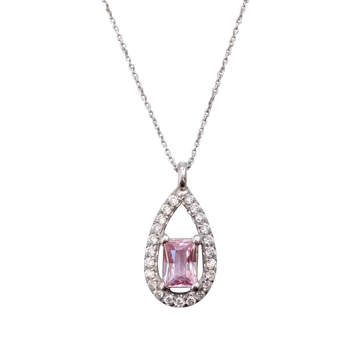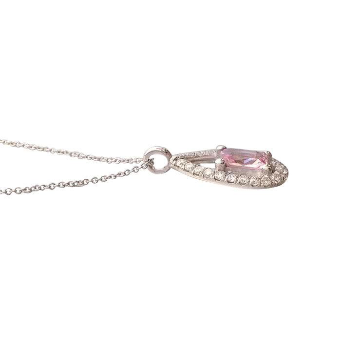 With a princess cut Padparadscha Sapphire held by prongs at the center of this beautiful elongated drop studded with diamonds; this pendant will surely add a touch of elegance to her style. Set in 14K white gold, the natural, untreated and unheated padparadscha comes with a GRS certificate supporting the gems origins.