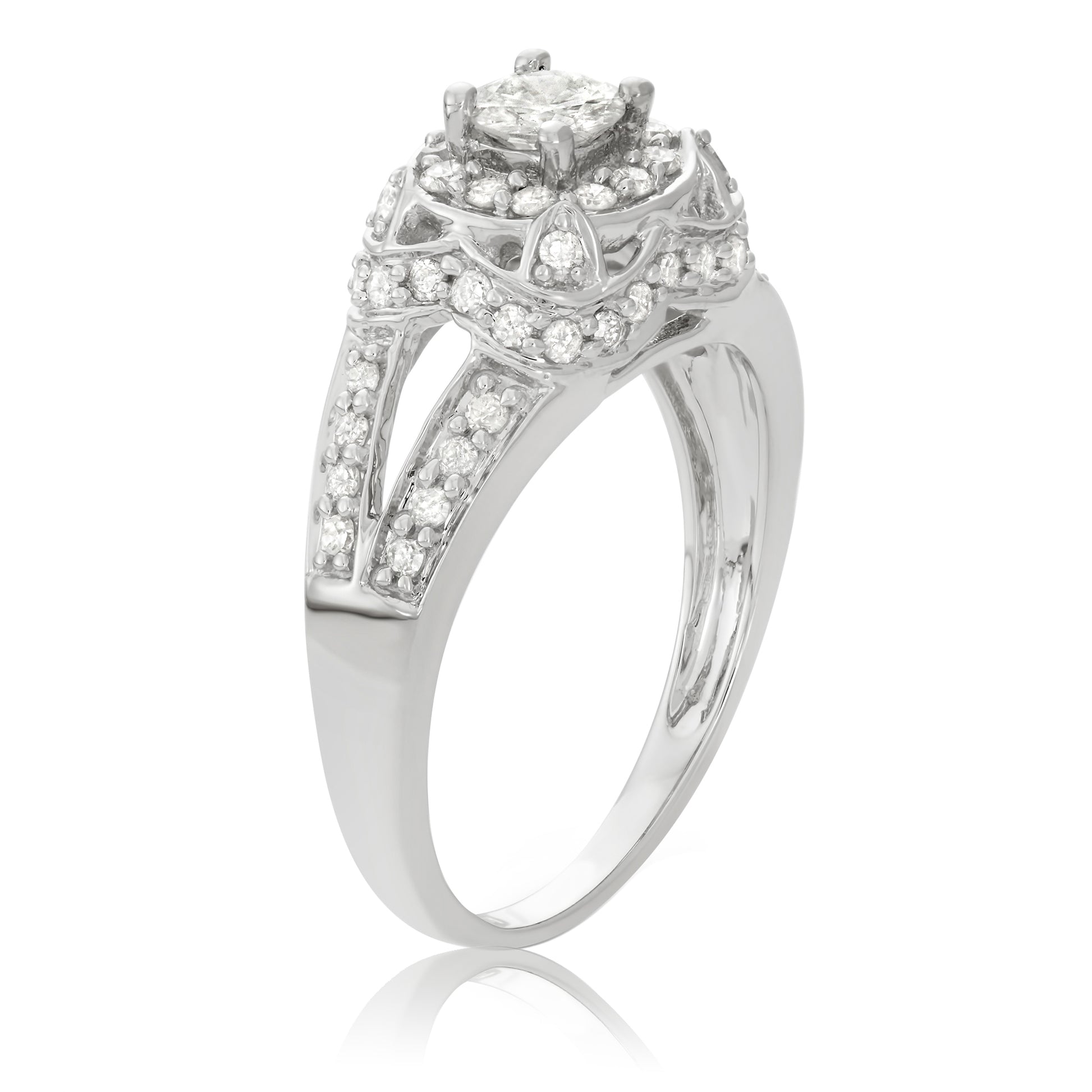 This 14-karat white gold engagement ring features an approximately 3/8ct round-cut white diamond in the center of a halo design. The center stone is accentuated with an additional 56 diamonds decorating each side of the split shank band. The halo-style engagement ring weighs 1 carats TDW and is avialble in sizes 5 through 9.