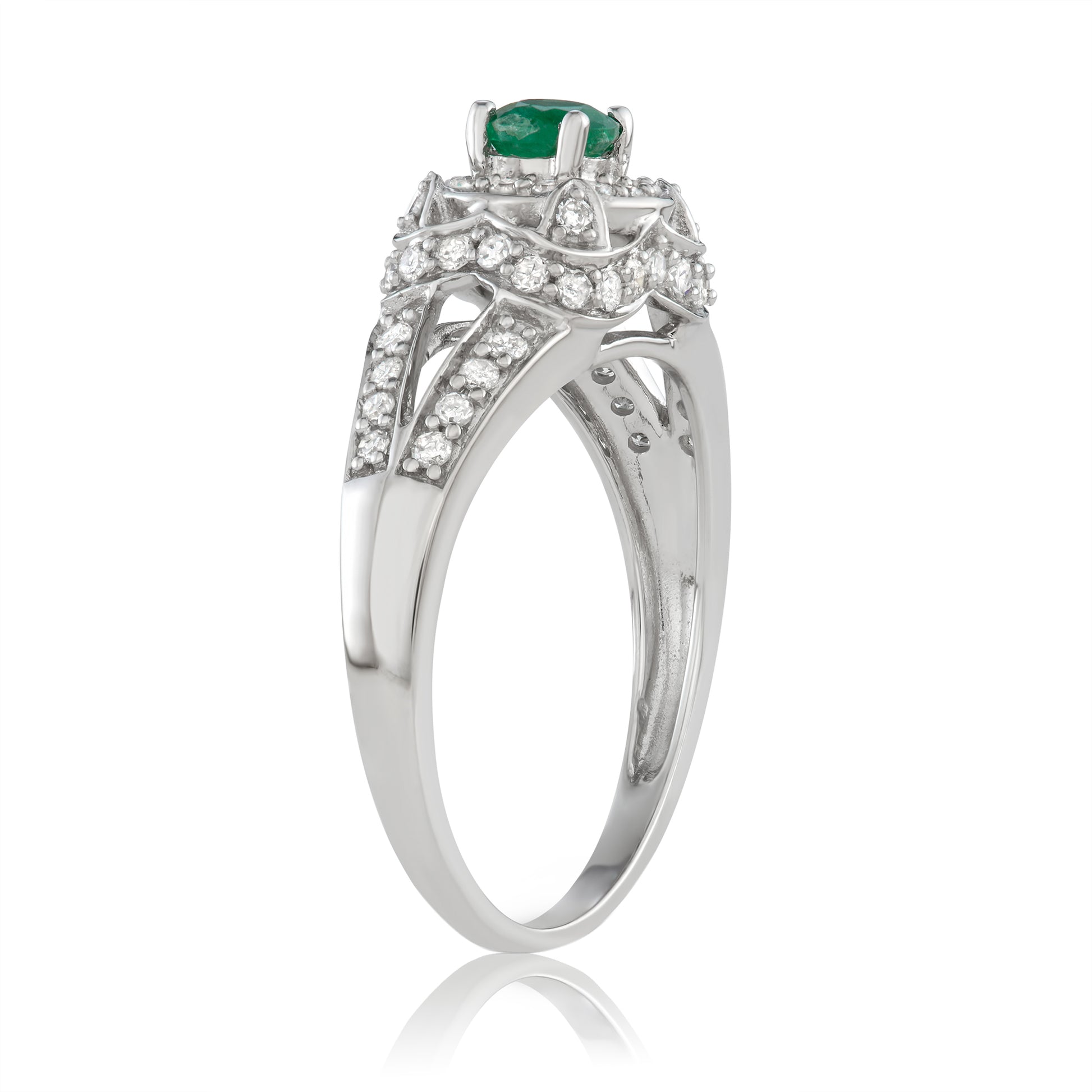 Diamonds galore decorate this beautiful engagement ring that is crafted in crisp white 14-karat gold. The diamonds decorate an elevated halo and each side of the band including the delicate split-shank design. The dazzling sparkle of the diamonds and the rich white of the gold enhance the color of the 0.48ct round-cut deep green emerald resting in the center. This engagement ring is available in sizes 5 through 9.
