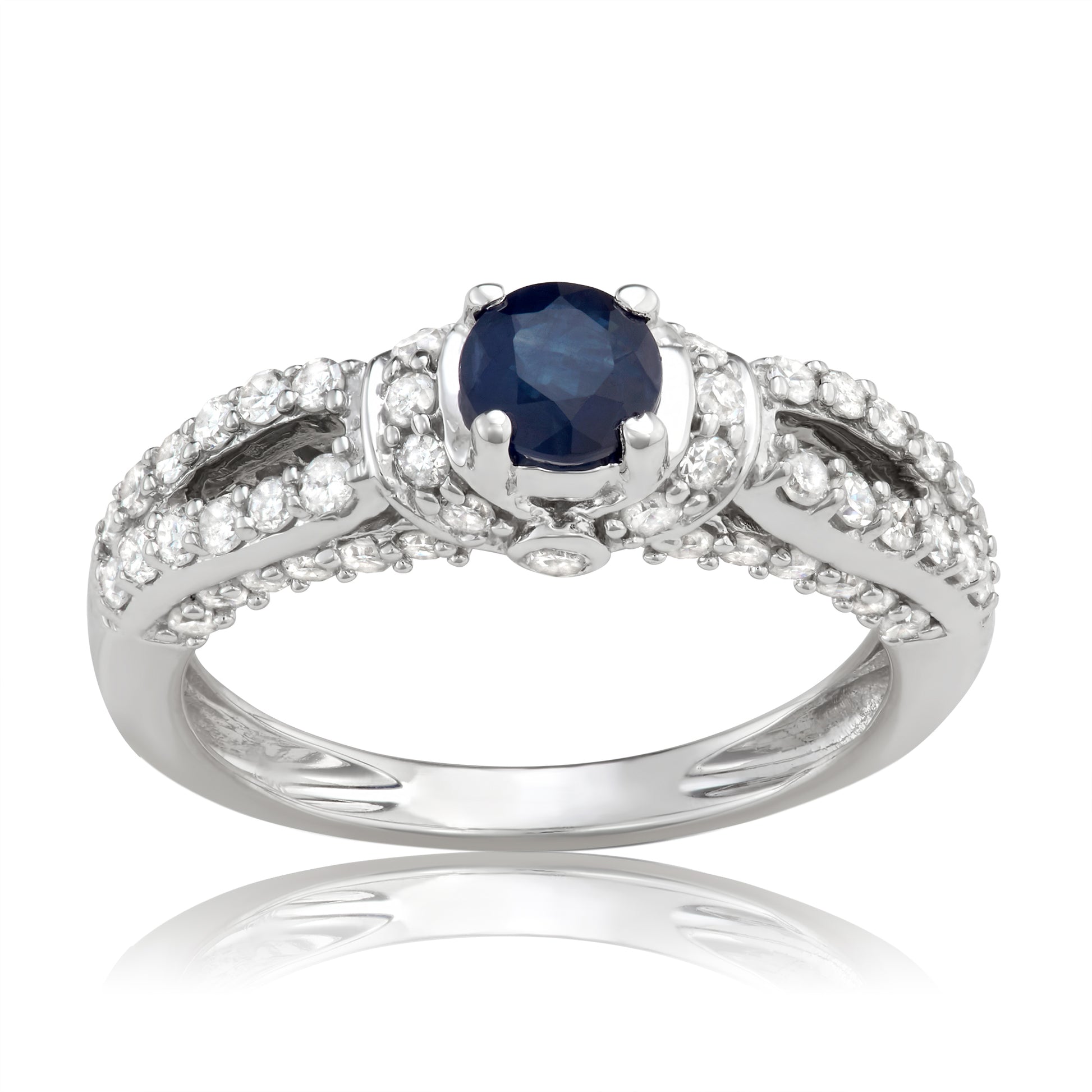 Engagement ring features 0.45ct Round-cut Blue Sapphire Engagement ring is accentuated with 0.61ct TDW round-cut white diamonds
