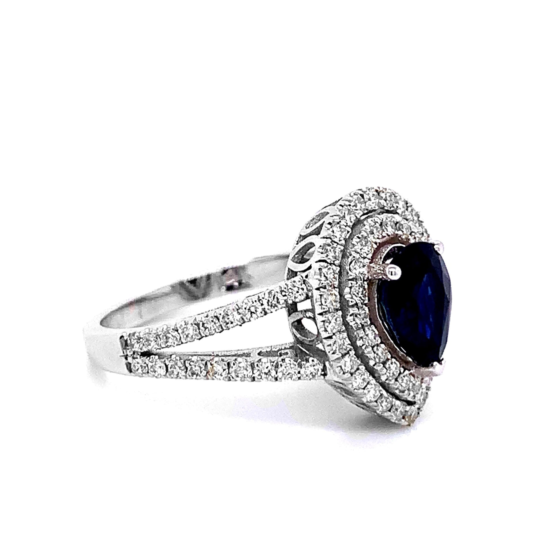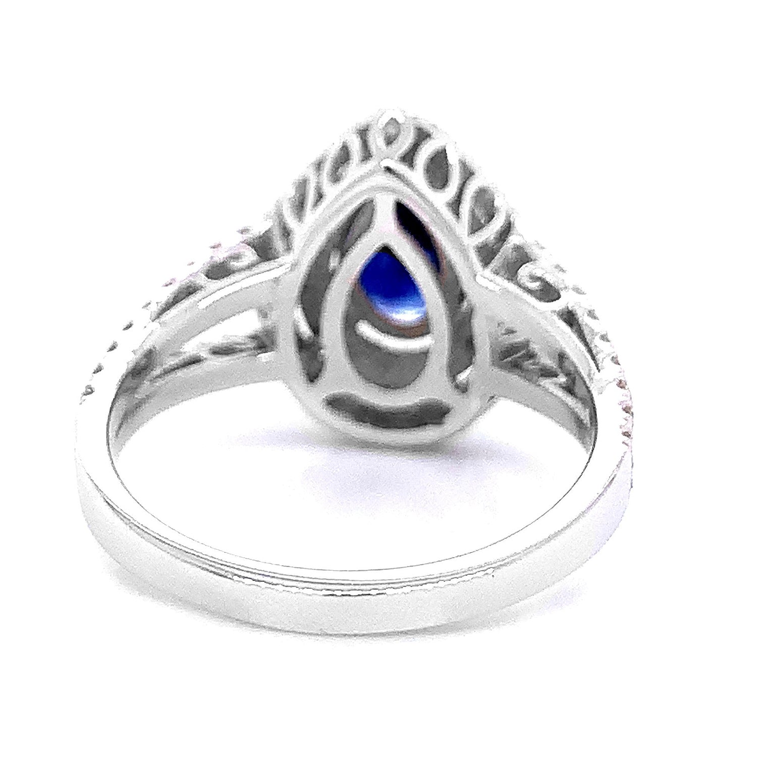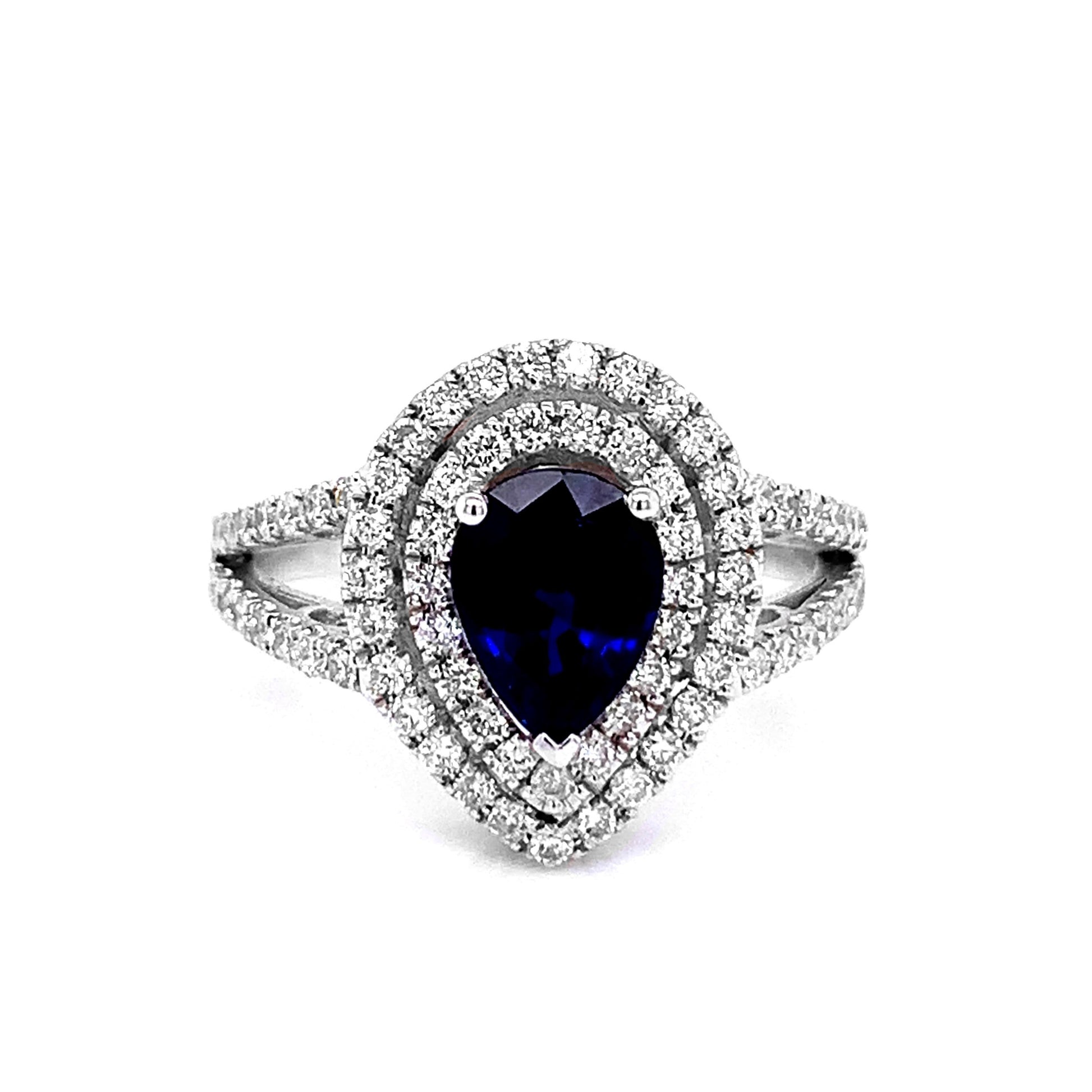 A spectacular pear-shaped deep blue sapphire rests in the center of this beautifully diamond lined ring creating a gorgeous engagement or anniversary ring in size 6. The deep blue sapphire weighs 1.18 carats and is surrounded by 2 halos of round-cut white diamonds. Diamonds line the split shank band for a total of 0.57 carat TDW. This dazzling and vibrant ring is available in size 6.Details:
