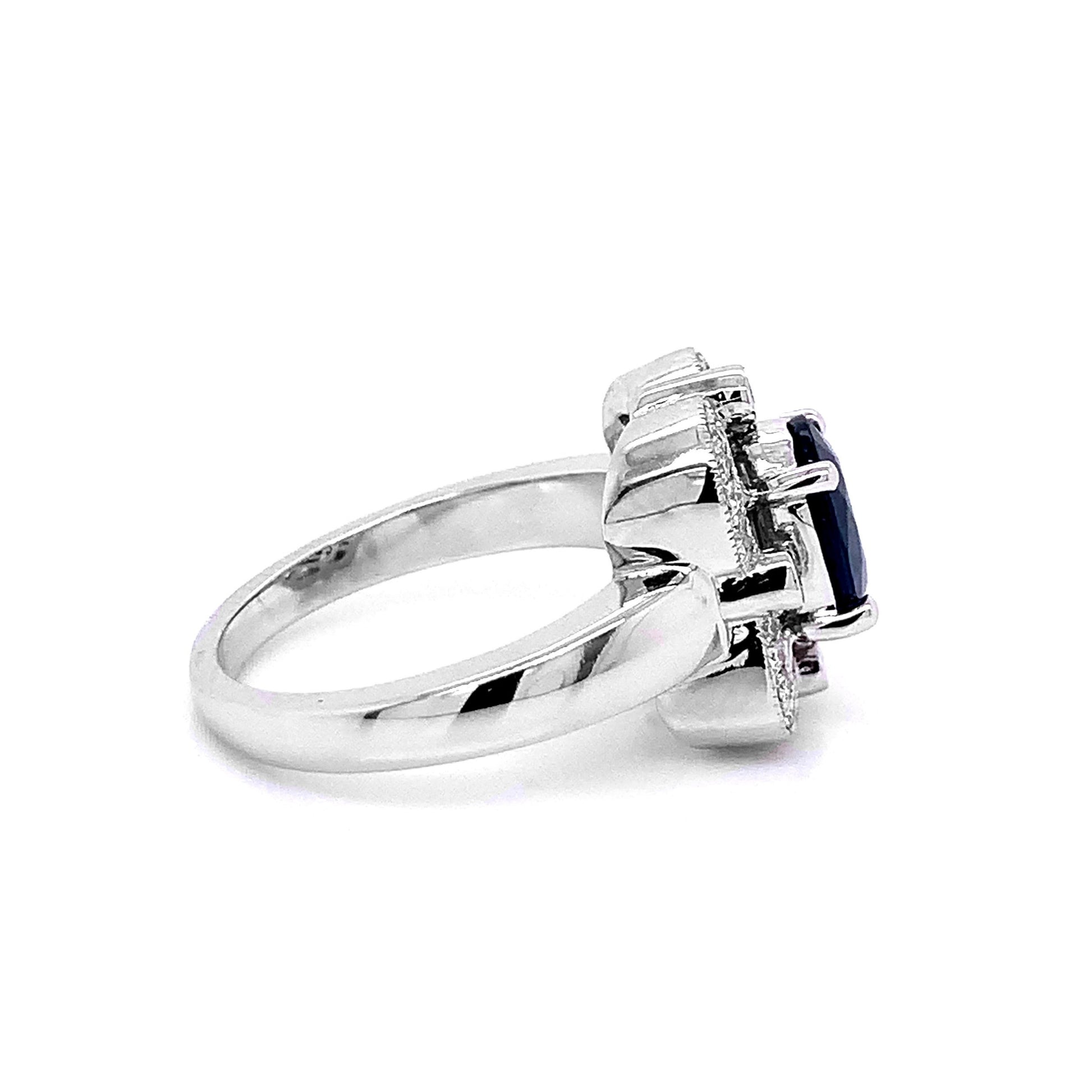 A gorgeous art-deco style ring in 14-karat white gold, this beauty features a deep blue oval-cut sapphire weighing 1.70 carats TGW. The elaborate design is decorated with 22 round-cut white diamonds weighing 0.22 carat TDW. The polished band completes the delicate beauty of this design. The ring is available in size 6.25.Details: