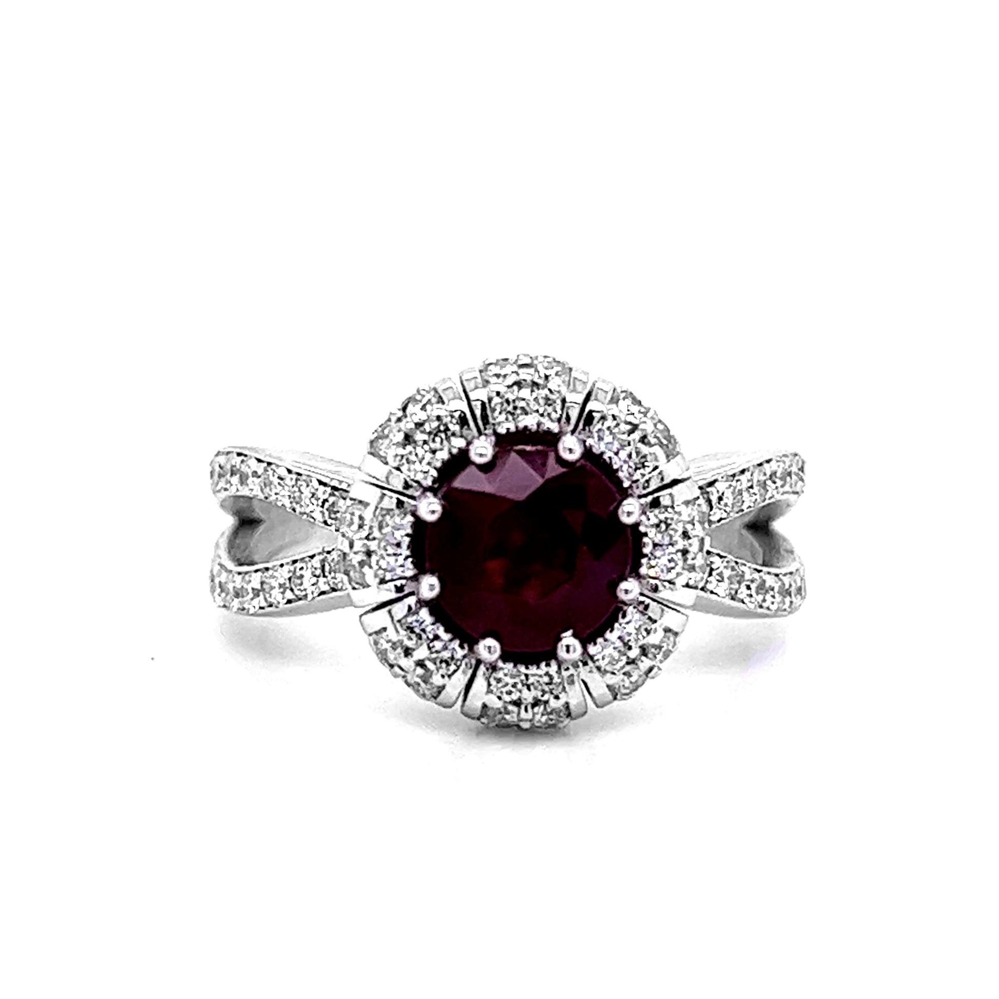 A gorgeous deep red round-cut ruby weighing 1.40 carat TGW sits in the center of a cupped halo of round-cut white diamonds. Additional diamonds decorate the curved split shank band of this 14-karat white gold ring. The 112 white diamonds weigh a total of 0.92 carat TDW in this size 6 ring.Details: