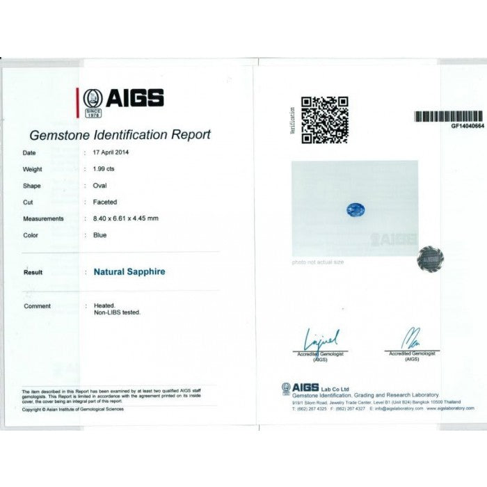 - 1 oval-shape natural blue sapphire from Sri Lanka weighs 1.99 carats