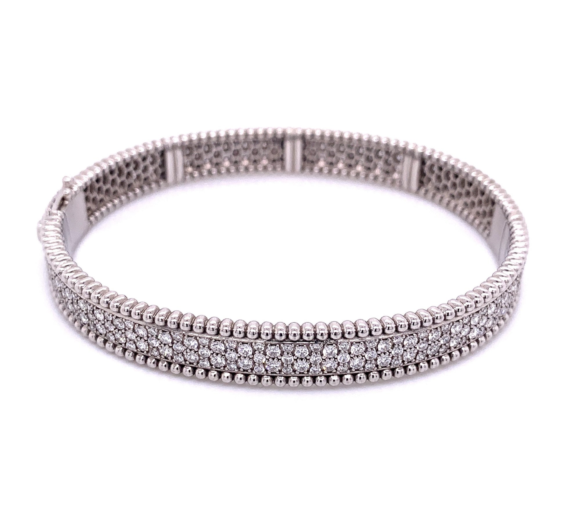 Designed in 14-karat white gold, this beautiful diamond bangle bracelet is a must have. The bracelet features 287 round-cut white diamonds in a pave setting and weighing 3.6 carats TDW. The diamonds rest in the center of the bangle and are ensconced on each side with a miligrain beaded design. The bracelet opens on a hinge and secures with a box clasp.Details: