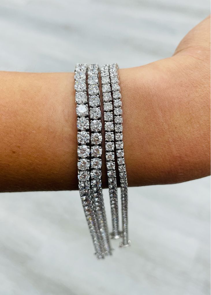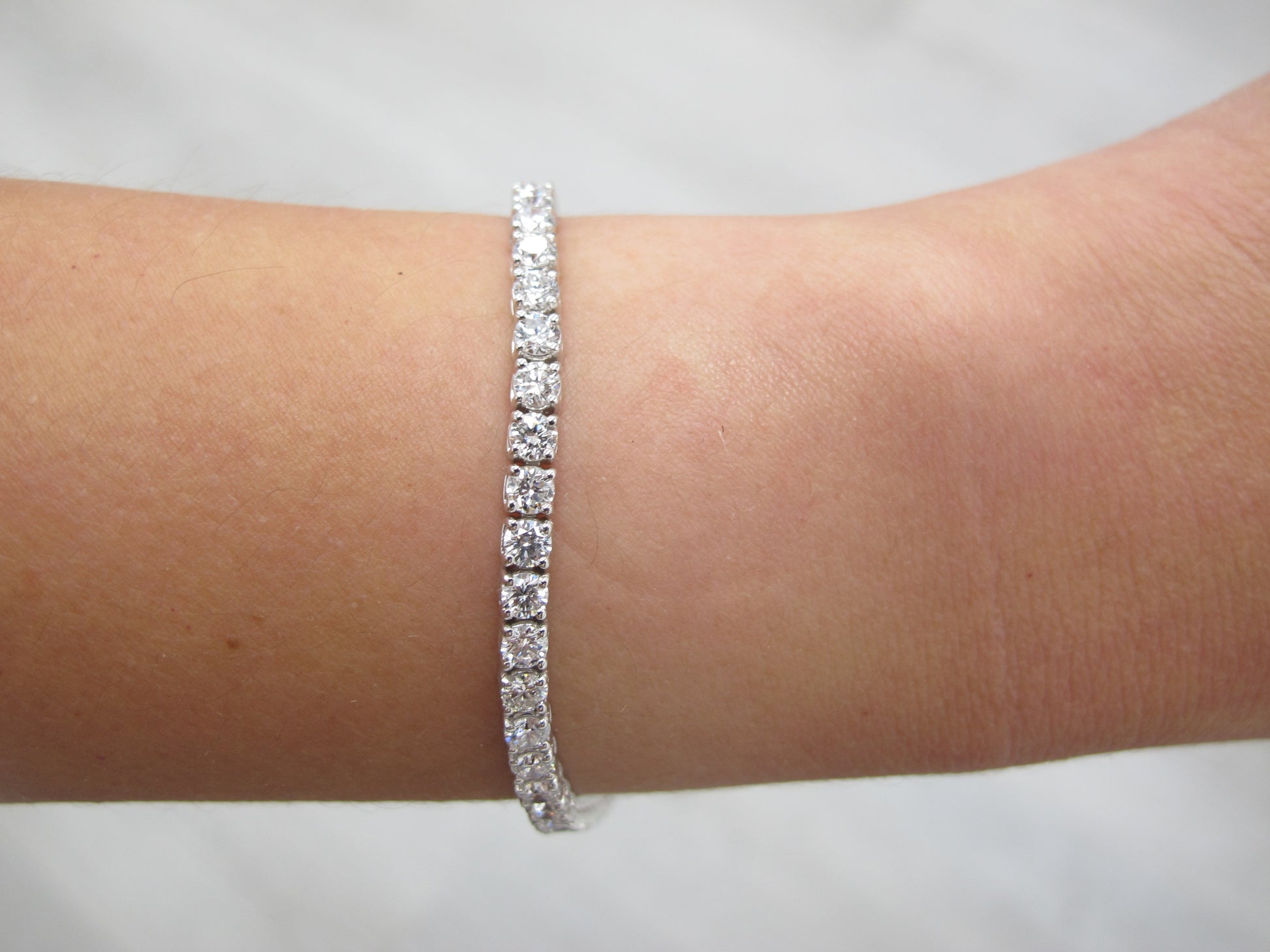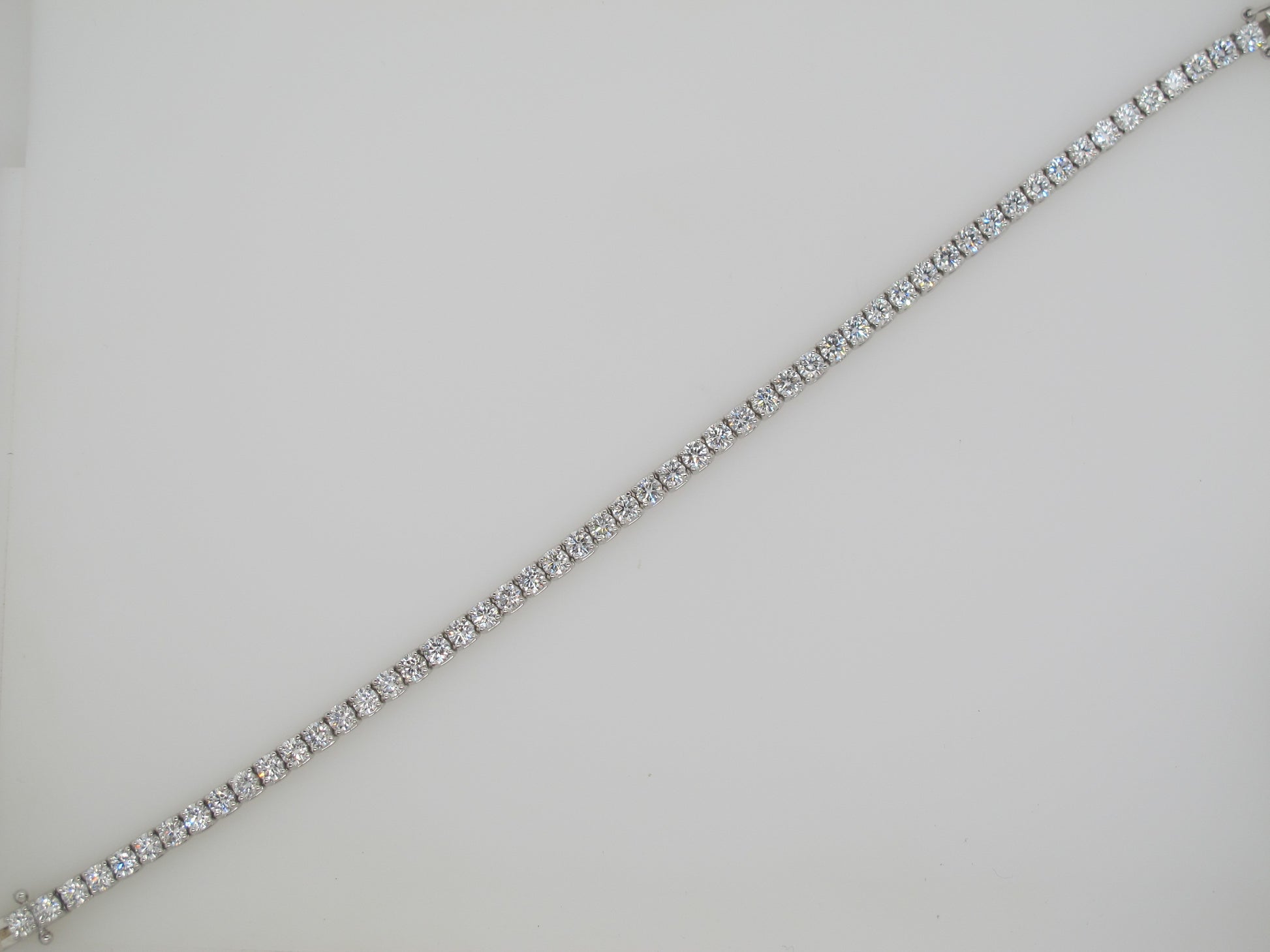 Gorgeous and designed with dazzling brilliant round-cut lab-grown diamonds in a classic tennis bracelet setting, this bracelet is the truest form of a pure and striking look of a classic design. Lab-grown diamonds are equal to mined diamonds in chemical, physical and optical properties as they are hand cut and polished by the same traditional methods. These lab grown diamonds are conflict-free and produced with very little impact on the environment. Lab grown diamonds offer an amazing savings while still offering the same level of luxury. This diamond tennis bracelet features 53 diamonds with a total weight of 5.19 carats and is set in 14-karat white gold with a length of 7 inches.