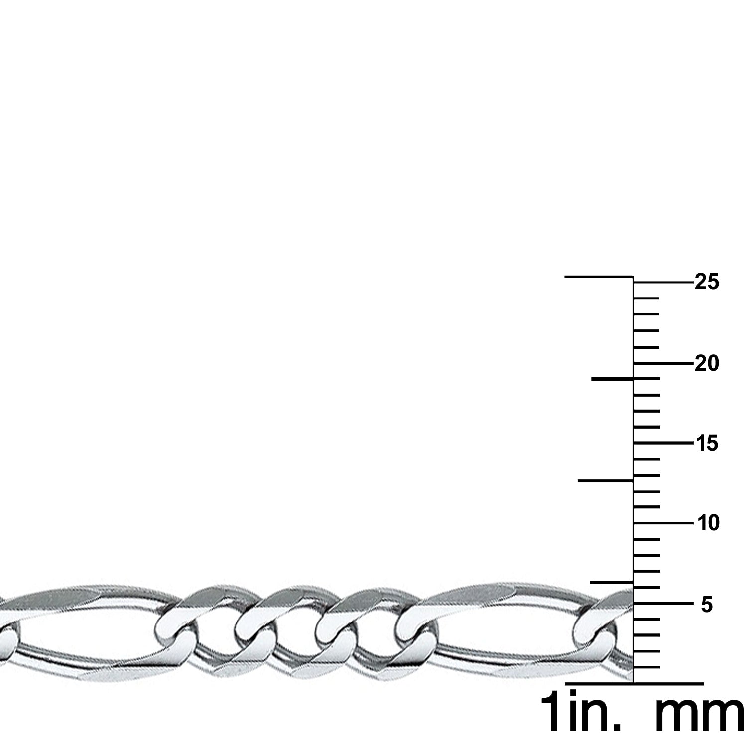 Designed in genuine 14-karat white gold, this Figaro chain features a 3 round links and 1 elongated link design. Each link features a concave design for smooth and comfortable wear. This Figaro chain measures 6 mm wide, making this a perfect size for men's wear. The necklace is available in 22, 24 and 26 inches long and secures in a lobster claw clasp.Crafted of 14k White gold