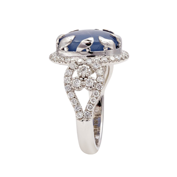 This ring is the perfect representation of the sun. With diamonds extending out like its warm rays, it has a beautiful cabochon star sapphire at its core. Weighing 6.73 carats, this star sapphire has an even tone with good color. The rings unique side profile will always be attracting a lot of attention.