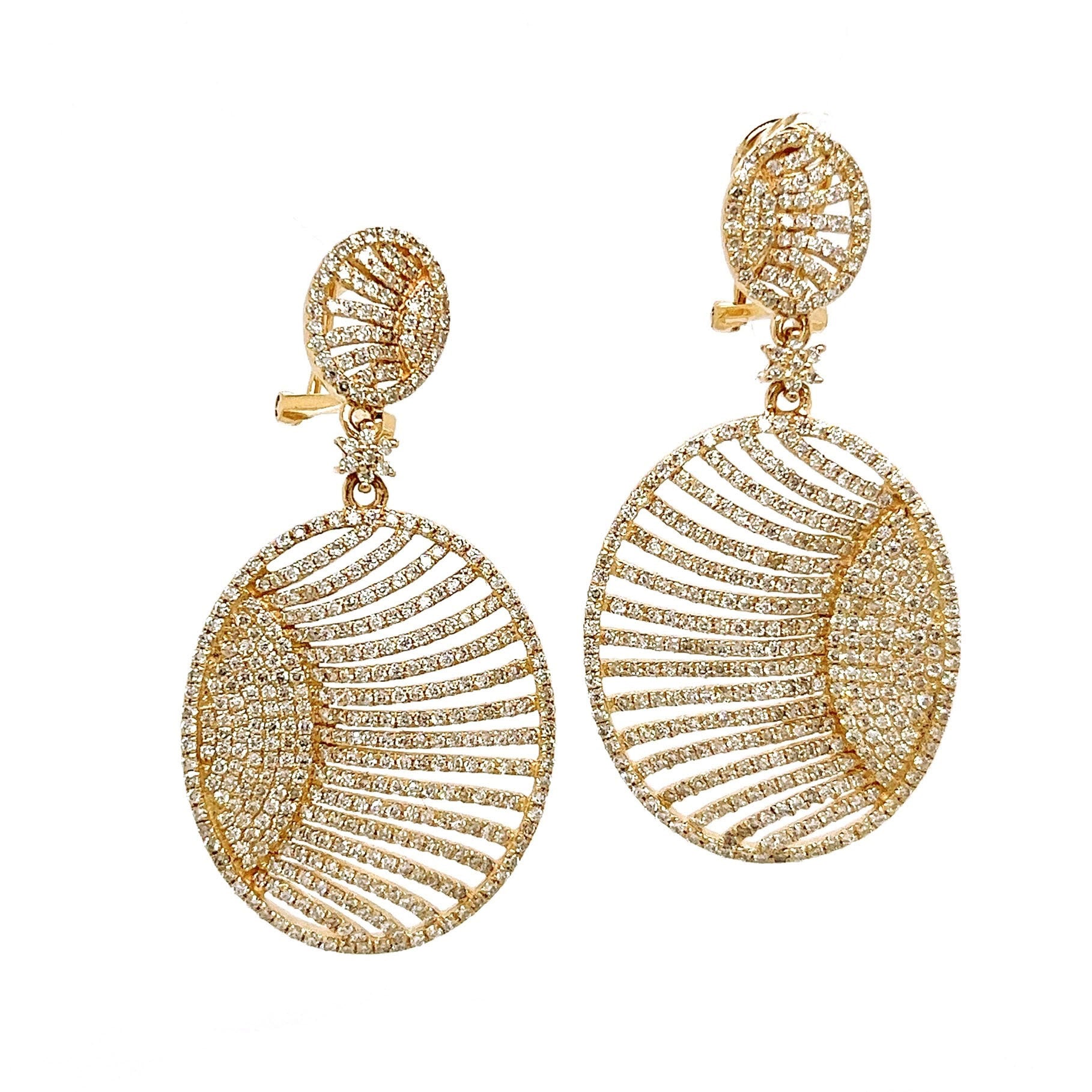 Designed in 14 karat yellow gold, these dangling drop earrings feature an astonishing 842 round-cut white diamonds weighing 2.65 carat total diamond weight. The earrings feature prong and pave-set rows of diamonds to create a sparkling wave design inside a halo of diamonds. The earrings measure 1.65 inches long and secure with a leverback closure.