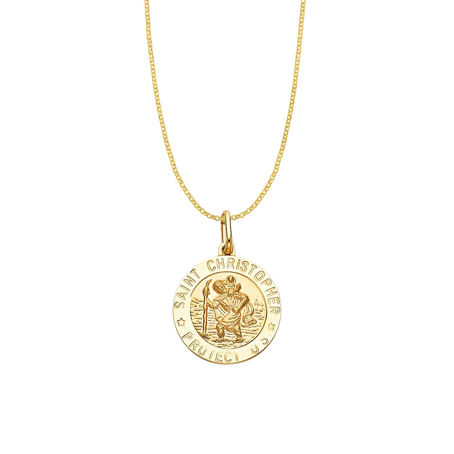 This saint medallion is crafted of 14-karat yellow gold. The round shape enhances the image of Saint Christopher. Circling the image are the words ' Saint Christopher Protect Us'. This pendant measures 0.82 inches long. The pendant is completed with a matching 14k yellow gold 1.6-mm rolo rolo chain in your choice of 16 inches to 24 inches long.