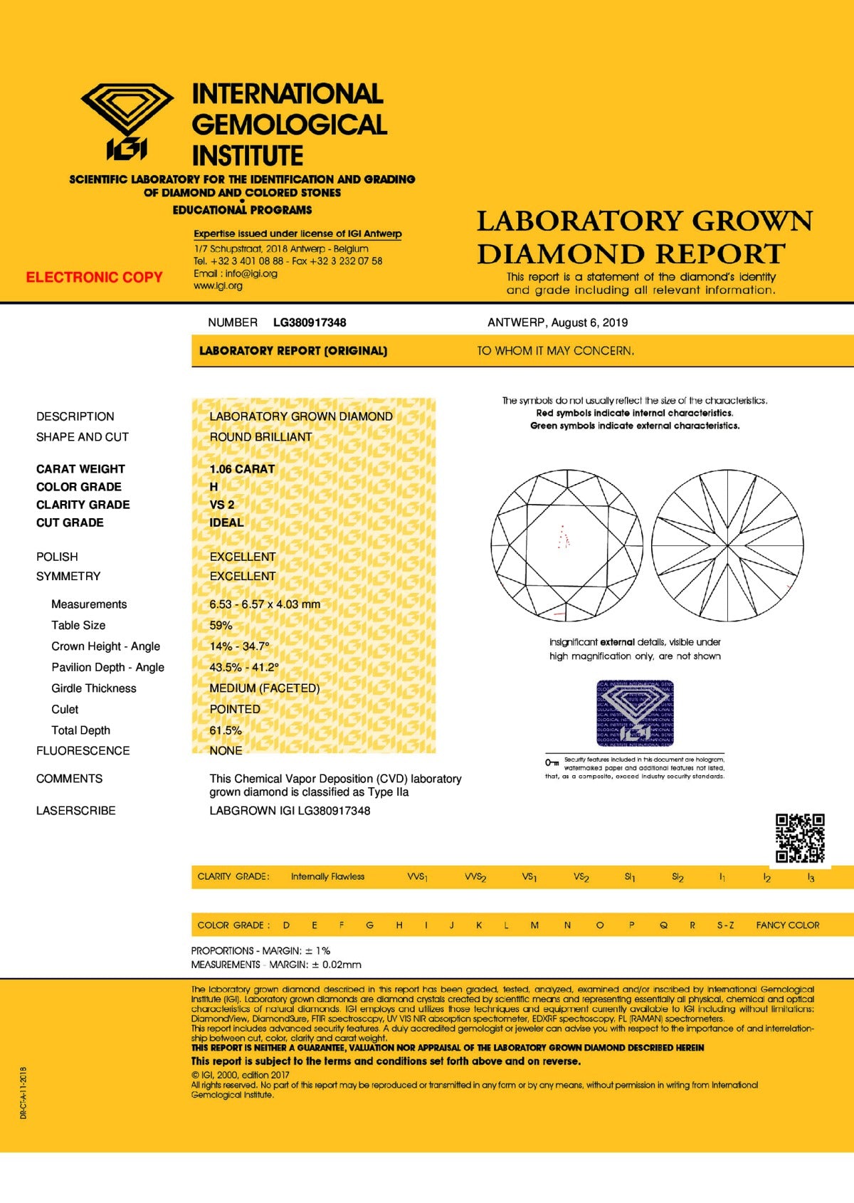 This Round Brilliant diamond solitaire engagement ring showcases a brilliant round-cut lab-grown diamond in a classic 4-prong setting creating a pure and striking look and a classic symbol of luxury. Lab-grown diamonds are equal to mined diamonds in chemical, physical, and optical properties as they are hand cut and polished by the same traditional methods. The diamond is certified by the prestigious Gemological lab IGI and is laser inscribed therefore, offering full disclosure and commitment to transparency assuring this lab-grown diamond is conflict-free and produced with very little direct impact on the environment. Lab grown diamonds offer amazing savings. This 1.06 carat brilliant-cut diamond features H color and VS2 clarity and is hand set on 18 karat white gold in size 6.5.Diamond: