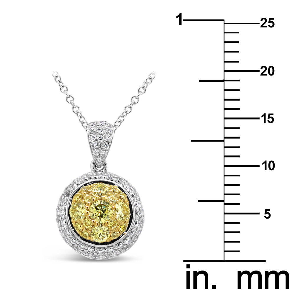 Crafted of 18 karat white gold with yellow gold accents, this gorgeous and unique pendant features a cluster of fancy yellow round-cut diamonds in a cluster weighing 1/3 carats TDW. The center cluster is accentuated with a halo of round-cut white diamonds to add a dazzling contrast with a total diamond weight of 1/4 ct TDW. The round shaped pendant is accompanied by a matching 18 karat white gold chain that measures 18 inches long with a lobster claw clasp. Each ethically mined diamond is hand selected to fit this pendant creating a unique one of a kind design.