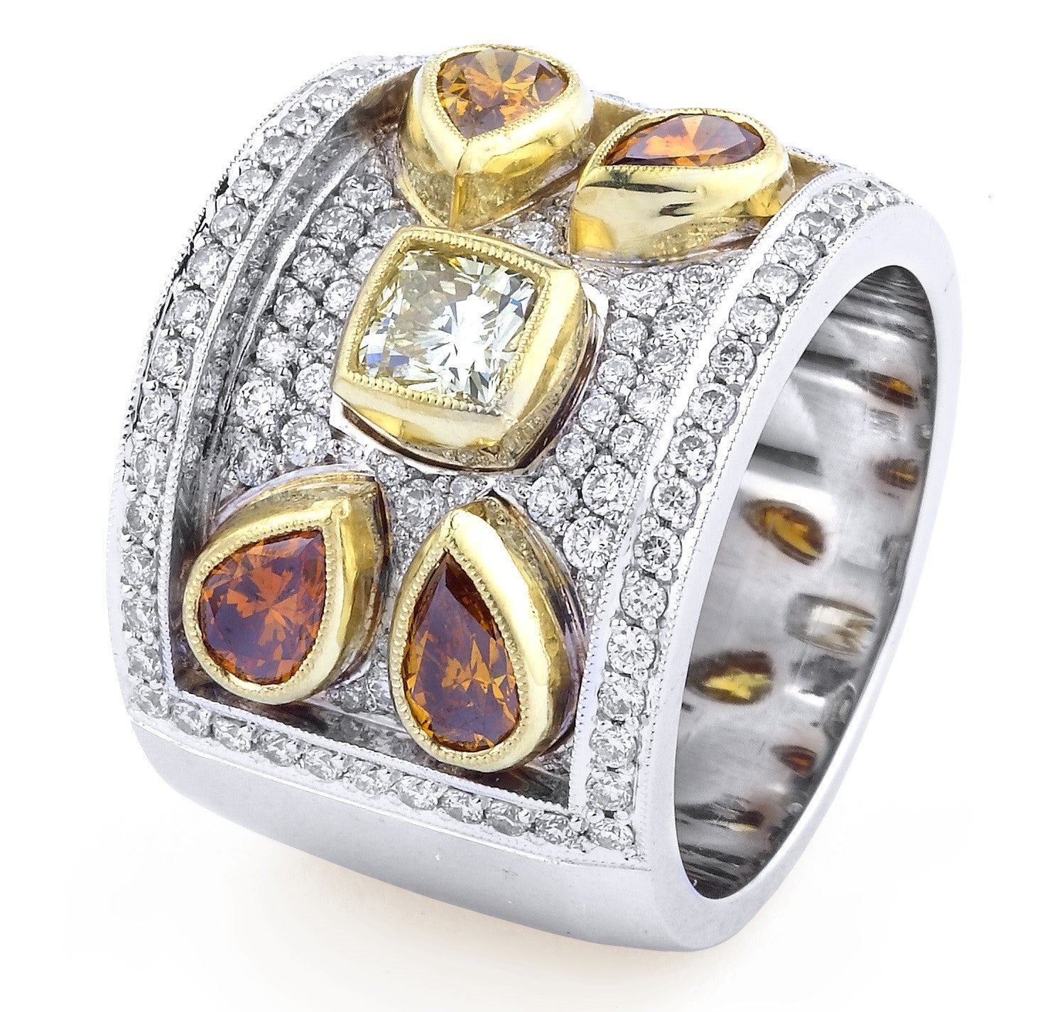 A ring like no other, this beautiful 18-karat white gold ring is lined with 104 round-cut white diamonds in a pave-setting. In the recessed center a single cushion-cut white diamond is placed in the middle and is surrounded by 4 pear-shaped fancy champagne diamonds. The diamonds are accented with yellow gold settings. This ring is truly unique and can make a stunning one of a kind wedding or anniversary band. This band can also be a stunning showpiece for an elegant affair. This ring features 2.62 carats TDW and is available in size 6.5.Details: