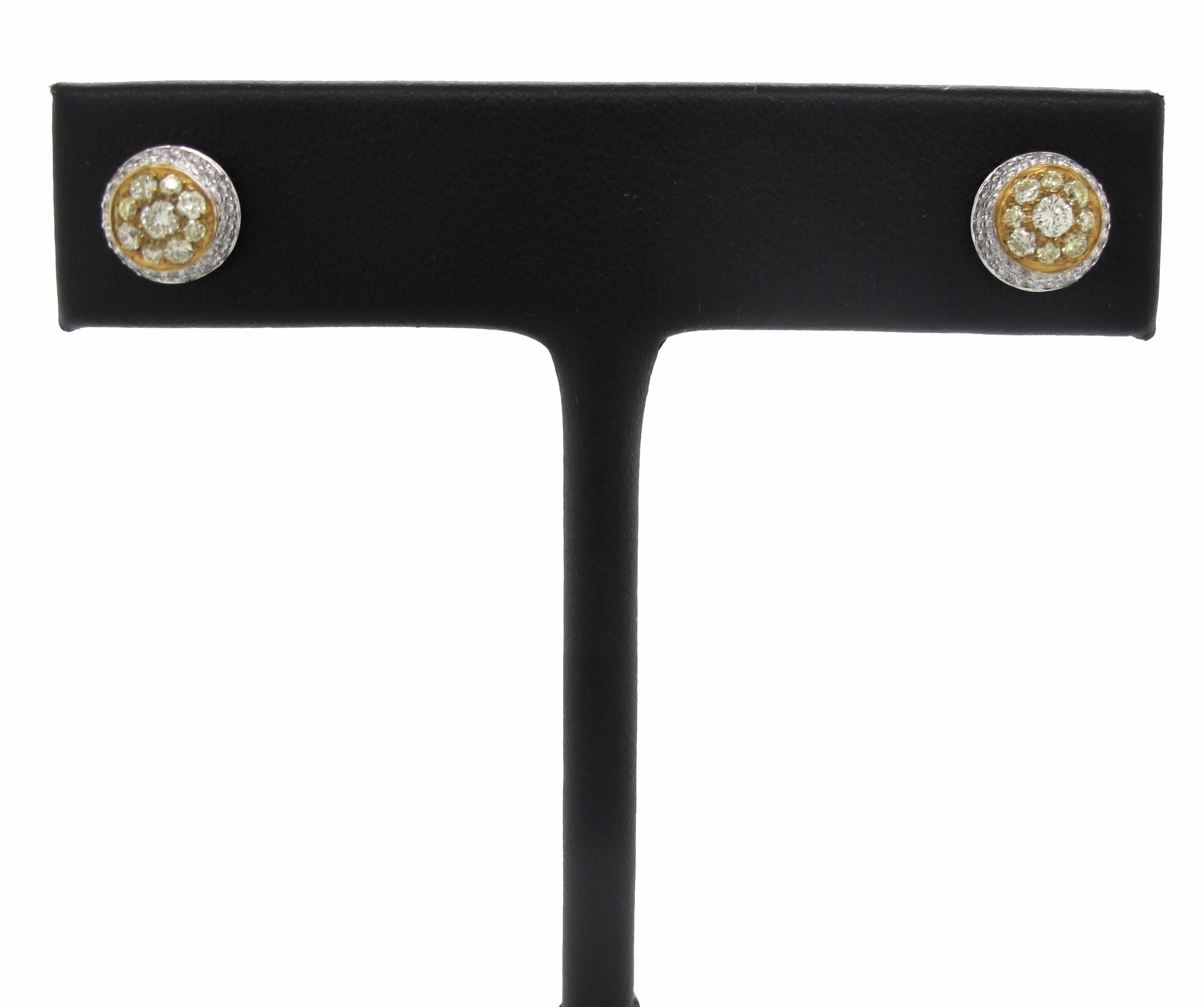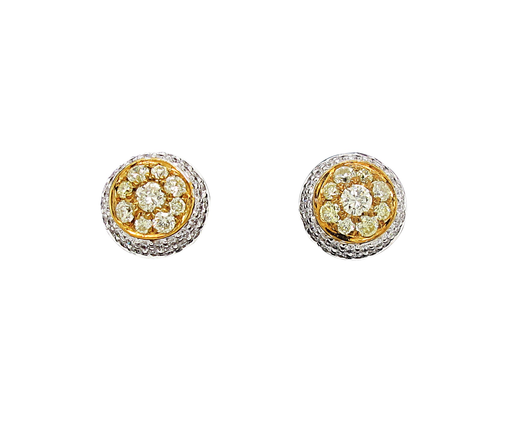 These beautiful round stud earrings are crafted of 18-karat white gold wth yellow gold accents. The round shaped earrings feature a floral cluster setting with fancy yellow diamond weighing 1/3 carats TDW. The earrings are encircled with round-cut white diamonds weighing 1/3 carat TDW. Each ethically mined diamond is hand selected to fit this earrings creating a unique one of a kind design.Earring details: