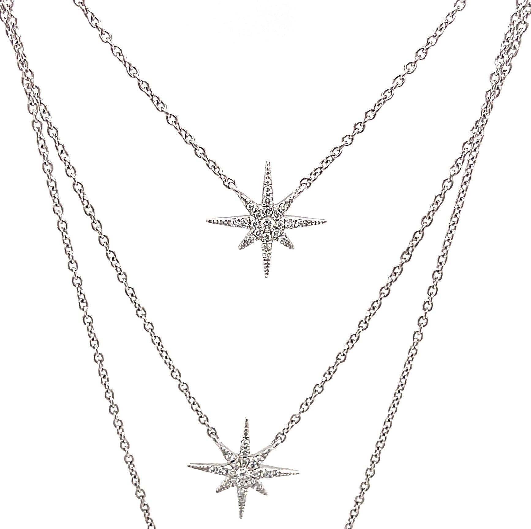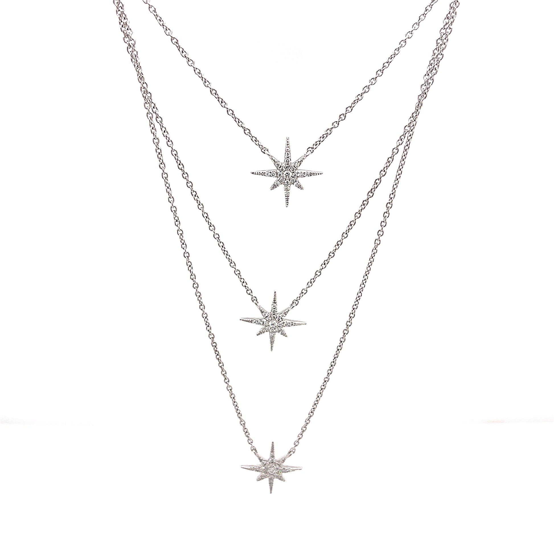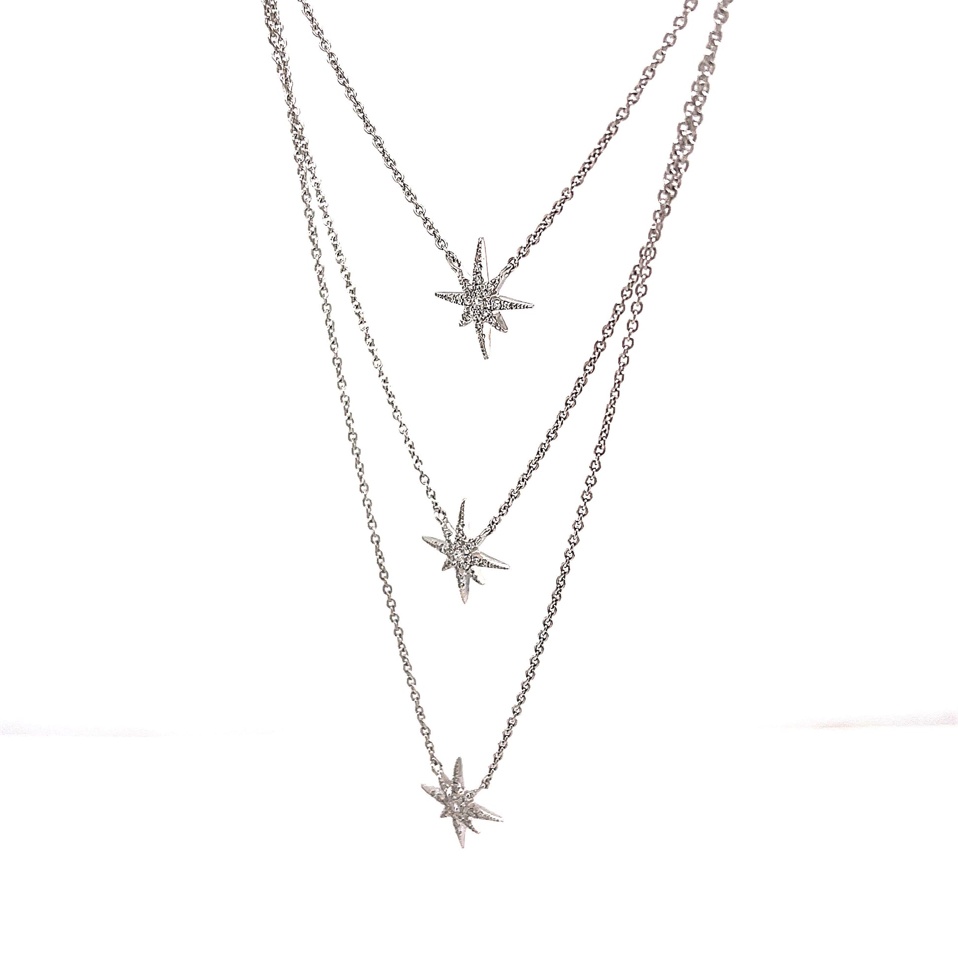 This beautiful and feminine necklace features a three-strand layered design. The center of each chain features nearly colorless white diamonds decorating the starburst design. This showstopping necklace is crafted of 18-karat white gold and features 0.21 carat TDW of round-cut white diamonds. The necklace measures 16 inches long with a 2 inch extension and secures with a lobster claw closure. Any woman would be lucky to dazzle the world with this beautiful and celestial design on their neck.Pendant details: