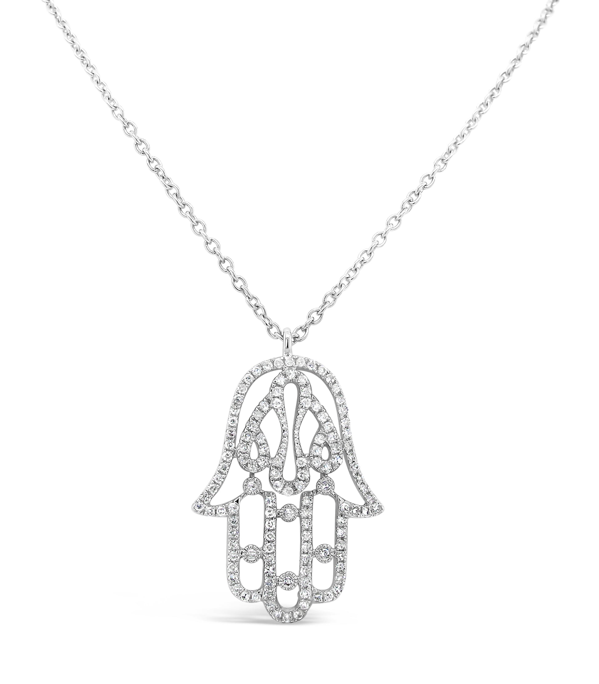 This beautiful and spiritual pendant features a Hamsa or Hand of Fatima design. The entire pendant is lined and decorated with 0.27 carats TDW of round-cut white diamonds expertly placed in an 18-karat white gold setting. This glittering pendant suspends from a 16 inch chain with a 2 inch extension and secures with a lobster claw closure. This pendant is a stunner and would be beautiful on the man or woman who wears it.