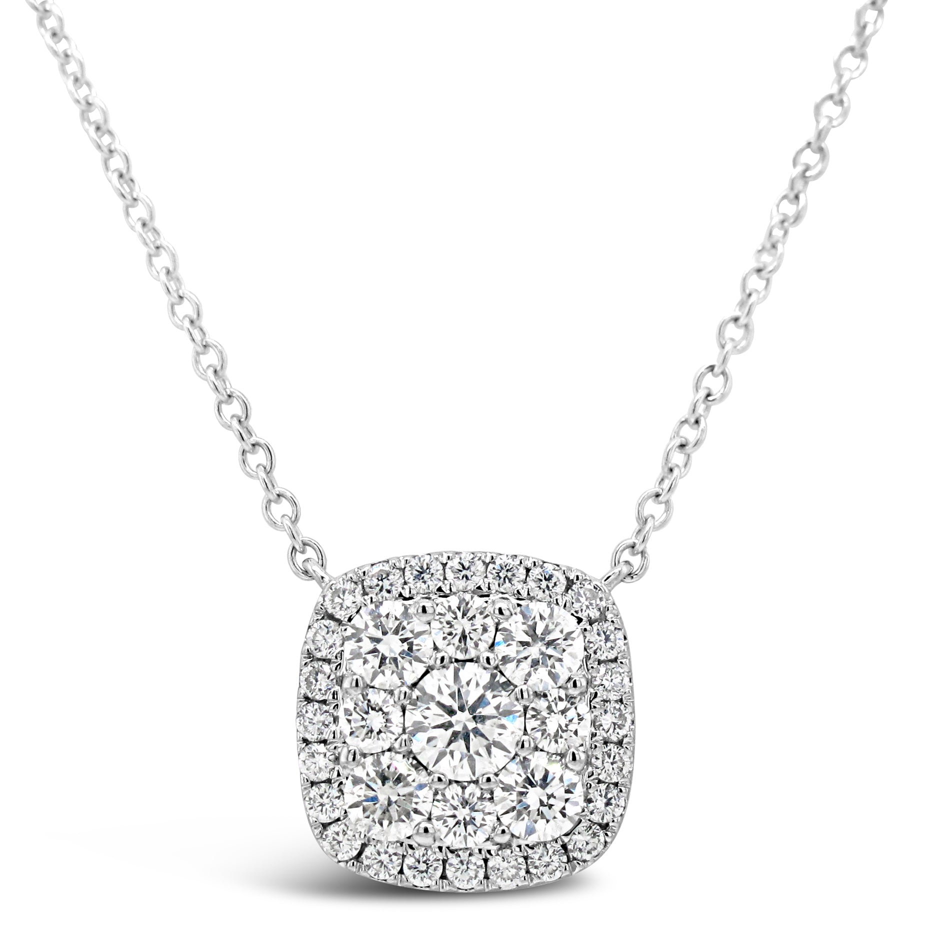 Created with 18-karat white gold, this beautiful square shaped pendant features 1.03 carat TDW of round-cut white diamonds. With assorted sizes in the center creating a dazzling cluster, the pendant features a halo design as well. Each ethically mined diamond is hand selected to fit this pendant creating a unique one of a kind design. The pendant slides on a 16 inch chain with a 2 inch extension and secures with a lobster claw clasp.