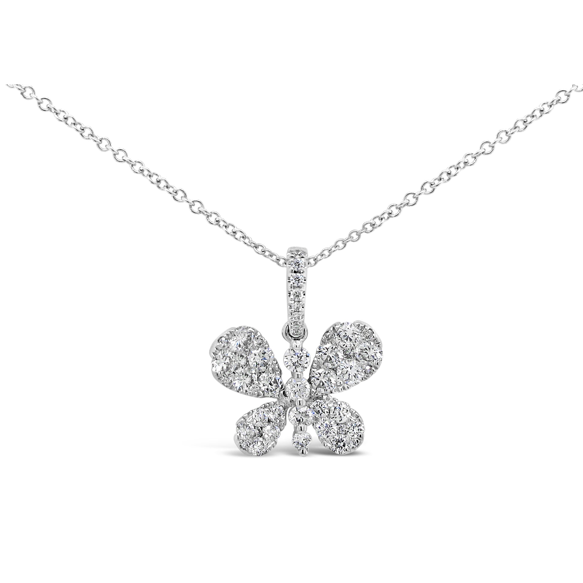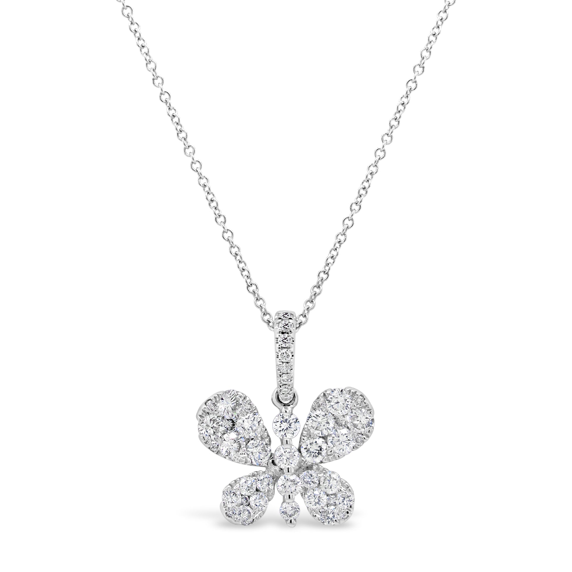 Gorgeously handcrafted of 18-karat white gold, this stunning pendant features a diamond studded butterfly shape suspended from a diamond lined bale. The pendant weighs 1 carat TDW of round-cut white diamonds. Each ethically mined diamond is hand selected to fit this pendant creating a unique one of a kind design. The pendant suspends from a 16 inch chain with a 2 inch extension and secures with a lobster claw clasp.Pendant details: