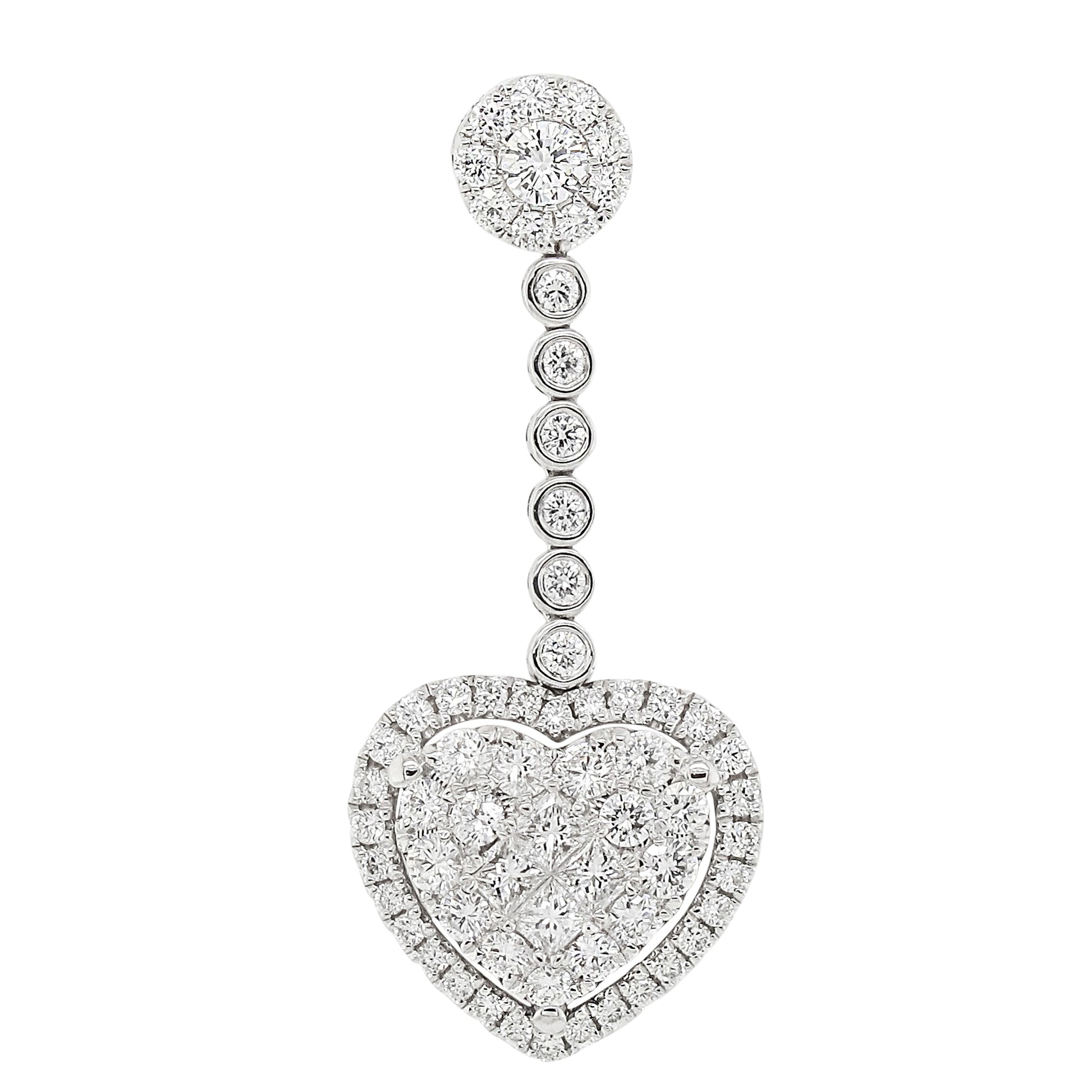 Lined with a row of round-cut white diamonds, this heart shaped pendant dazzles with 1 carats TDW. The center of the heart features 4 princess-cut diamonds in an invisible setting is set amongst round-cut diamonds to create a cluster of sparkling shine. The heart shape pendant suspends from a line of bezel-set round cut diamonds and a round shape with a large diamond surrounded by a halo of smaller diamonds. Each ethically mined diamond is hand selected to fit this pendant creating a unique one of a kind design. The pendant slides on a 16 inch chain with a 2 inch extension and secures with a lobster claw clasp.