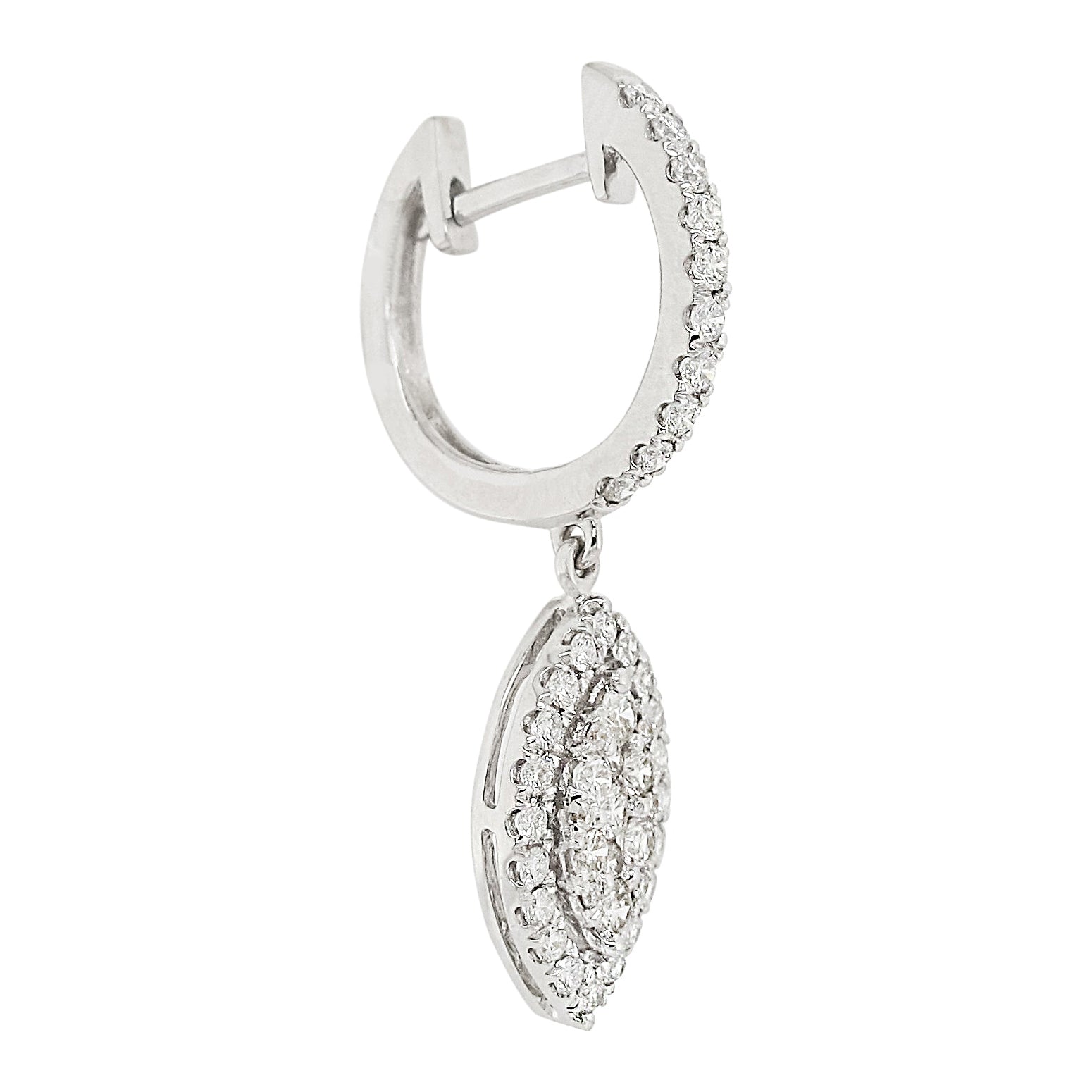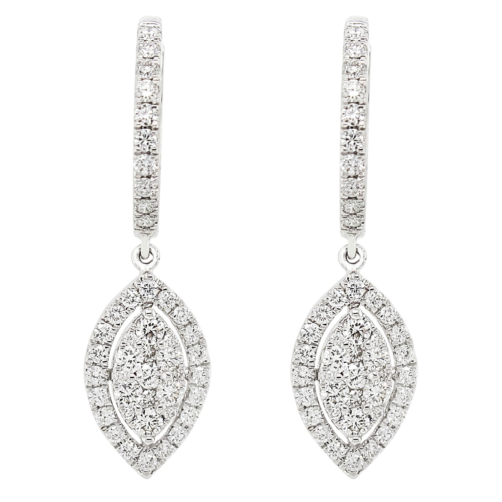 A gorgeous combination of classic design mixed with modern flair, these 18k gold earrings are accentuated with 1 carat of white diamonds. Suspended from a diamond lined hinged hoop is a tear drop shaped design with a cluster of round-cut diamonds in the center and a halo of sparkling diamonds around the design. The earrings measure just over 1 inch long and secure with a clip in closure for pierced ears.Earring details: