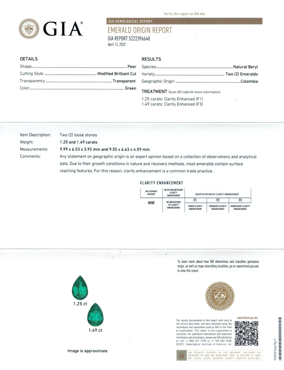 - 2 Pear-shape Brilliant/Step-cut Green Colombian Emeralds weighs 2.74 carats TGW