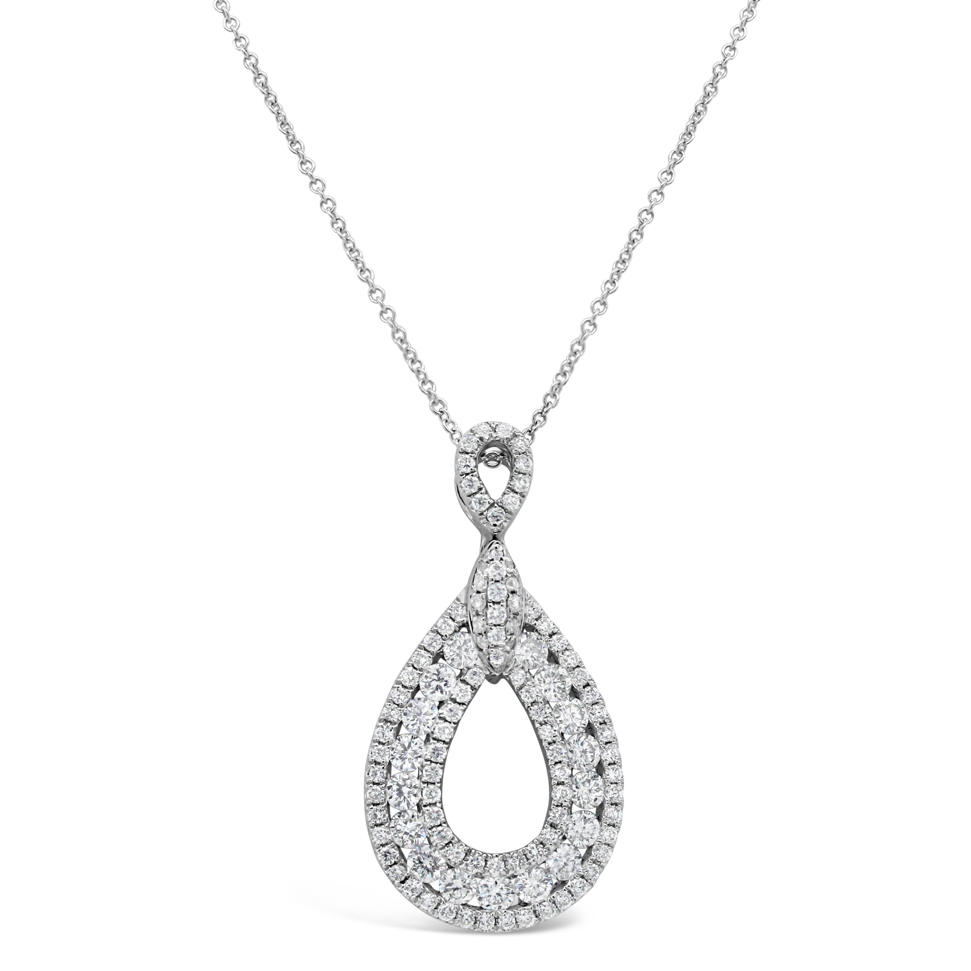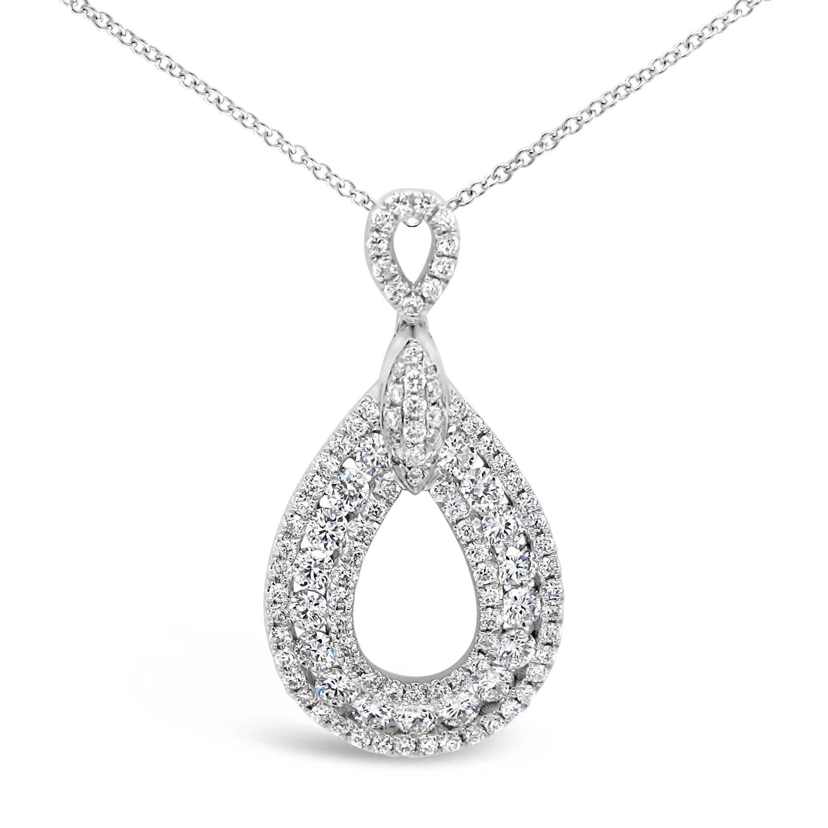 Crafted of luxurious 18-karat white gold, this stunning pendant features a pear shaped rings with assorted sized round-cut white diamonds weighing a total of 3/4 carats TDW. Each ethically mined diamond is hand selected to fit this pendant creating a unique one of a kind design. The pendant suspends from a 16 inch chain with a 2 inch extension and secures with a lobster claw clasp.Pendant details:
