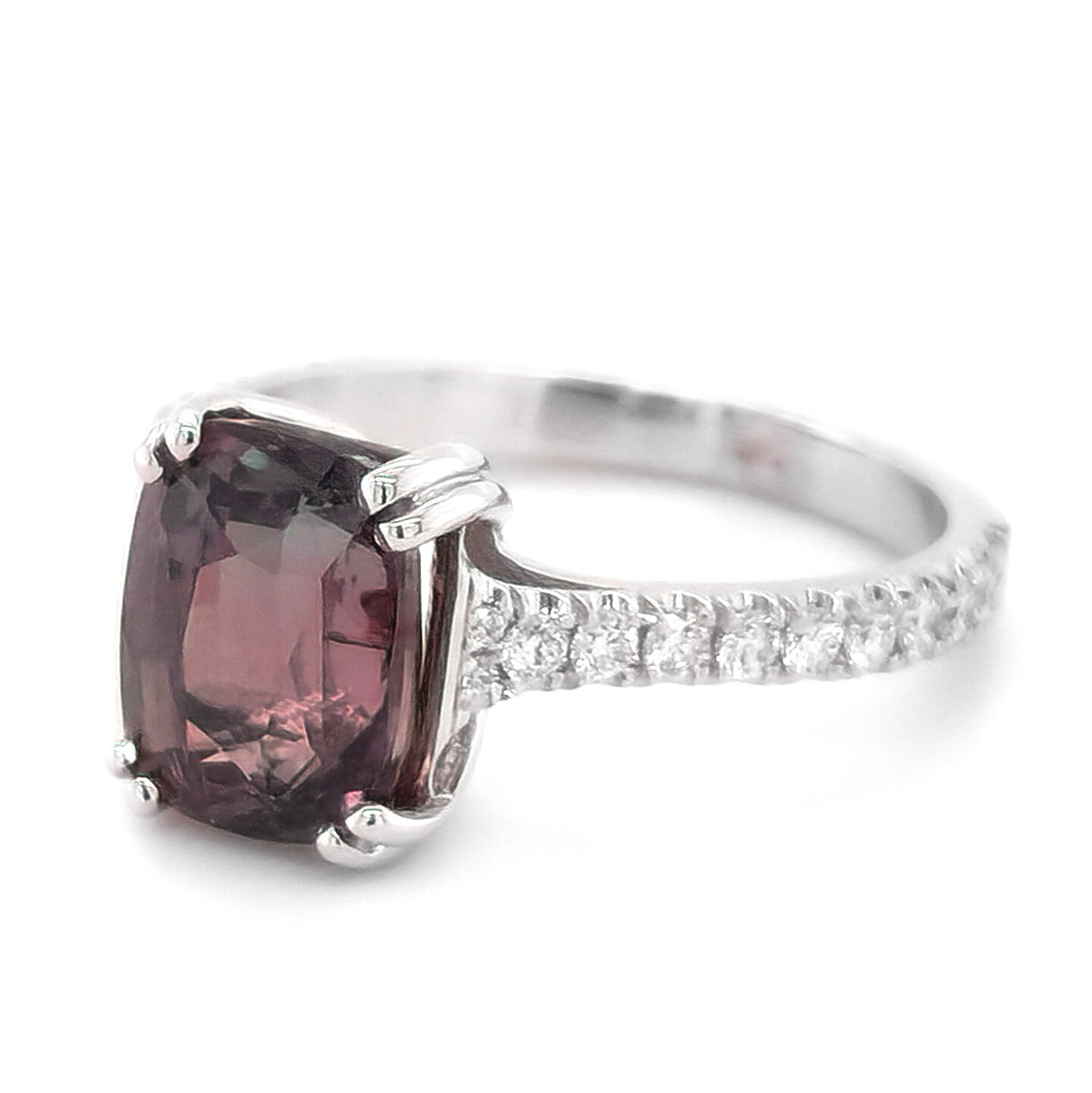 A rare color-change alexandrite and diamond ring. This natural 3.52 carats Alexandrite changes color from green in daylight to purplish pink in artificial light. Once only obtainable by czars and royalty, alexandrites are prized by gem connoisseurs and collectors. A modified brilliant cut and cushion shape is accented with 0.42 carats of diamonds decorating the sides of this unique 18K White Gold ring.