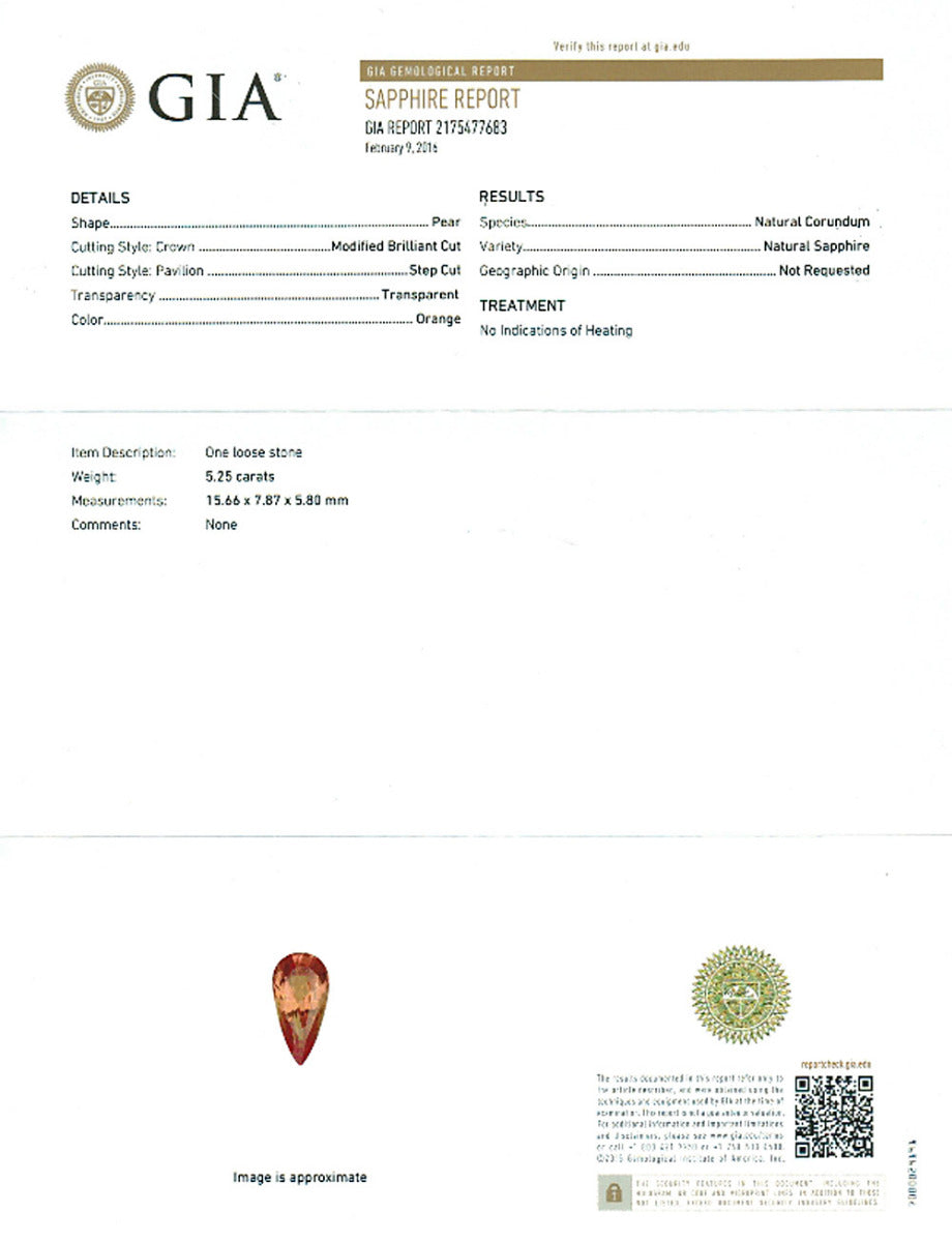 - 1 Pear-shape Brilliant/step-cut Orange Orange Sapphire weighs 5.25 carats TGW