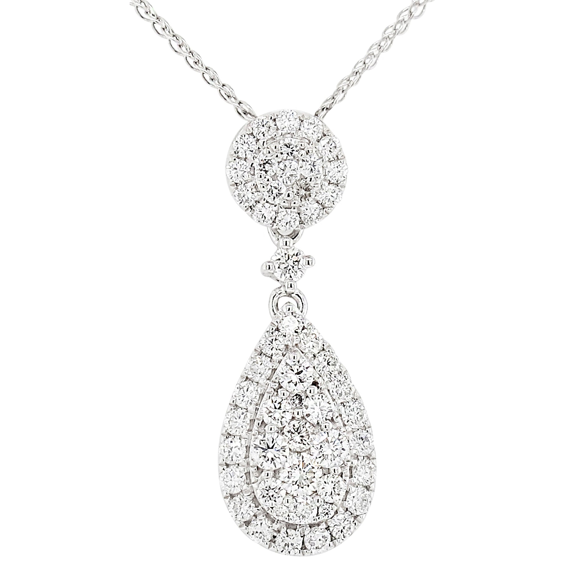 Handcrafted of 18 karat white gold, this stunning slide pendant features 5/8 carat TDW of round-cut white diamonds. A tear-drop shape decorated with a cluster of round-cut white diamonds is accentuated with a diamond studded halo. A single round-cut white diamond separates the tear-drop shape from the round-shaped slide, which is also decorated with a cluster of round-cut white diamonds. Each ethically mined diamond is hand selected to fit this pendant creating a unique one of a kind design. The pendant suspends from a 16 inch chain with a 2 inch extension and secures with a lobster claw clasp.