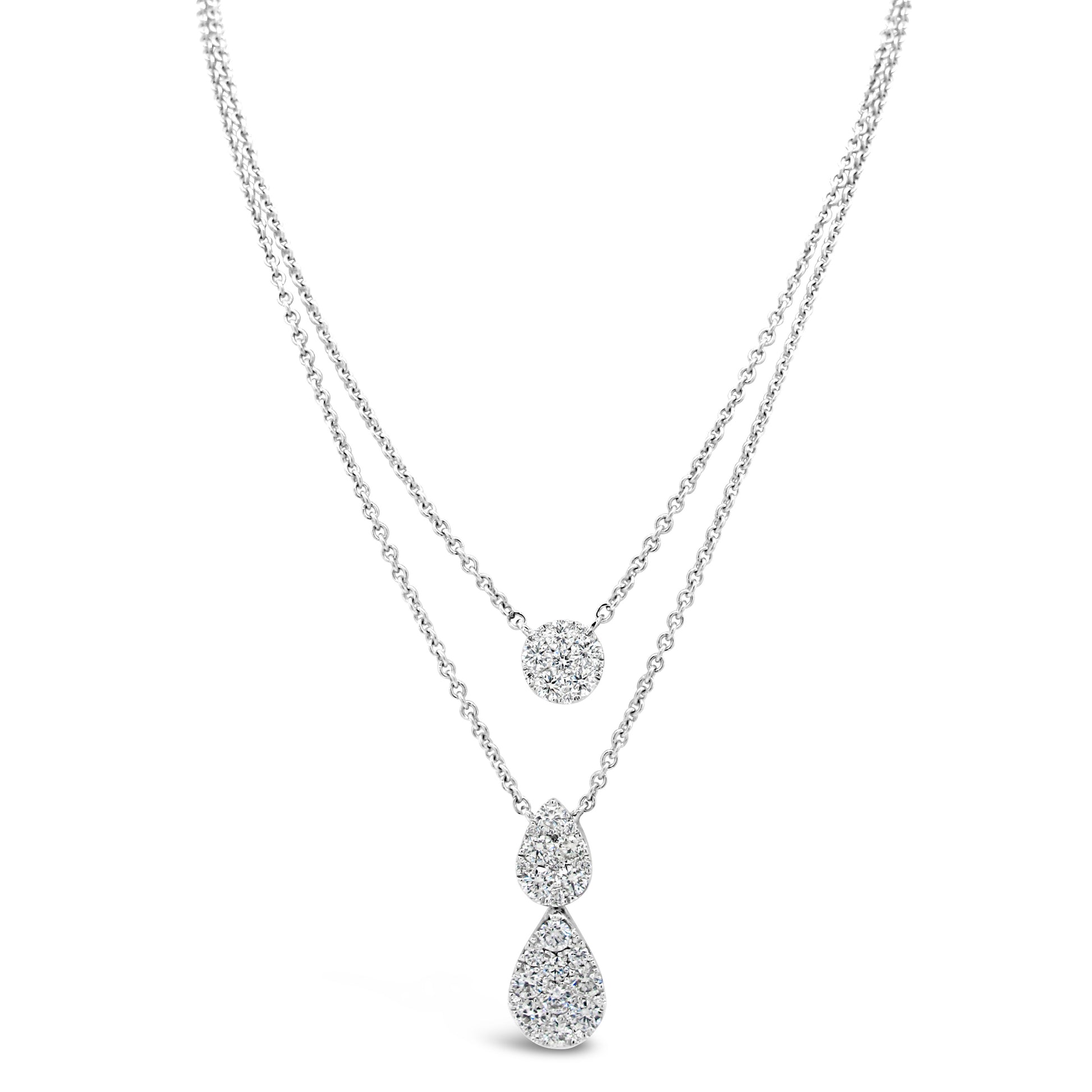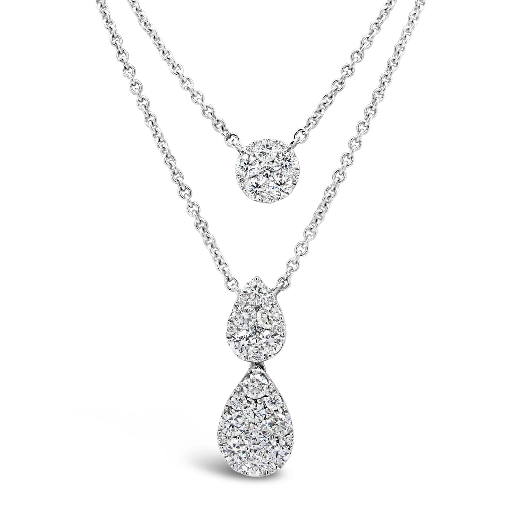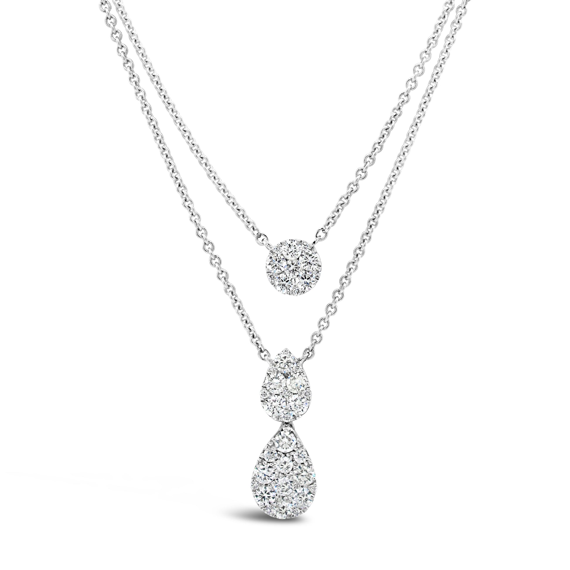 This beautiful double chain necklace features a round diamond encrusted shape suspended from the inner chain. The outer chain features 2 pear shaped diamond studded with round cut white diamonds. This necklace is crafted of 18-karat white gold and weighs 0.61 carats TDW. The chain measures 16 inches long with a 2 inch extension and secures with a lobster claw clasp. Each ethically mined diamond is hand selected to fit this pendant creating a unique one of a kind design.