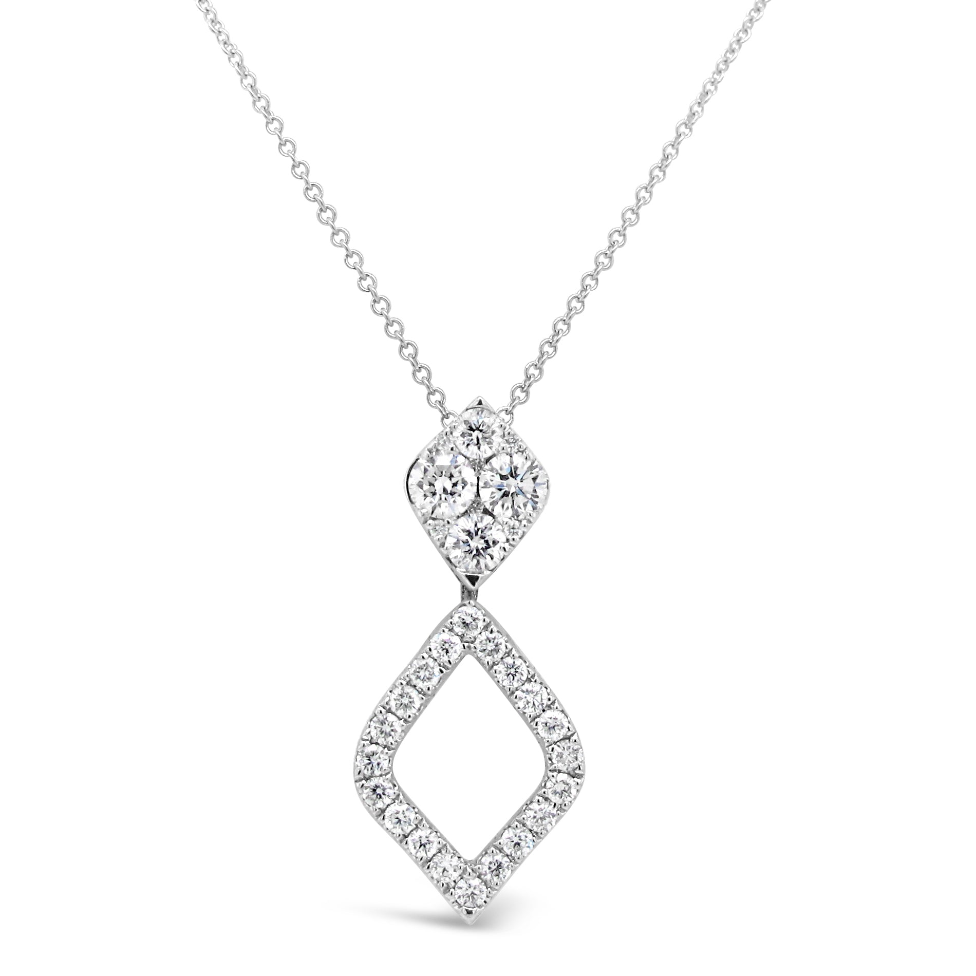 Crafted of 18 karat white gold, this gorgeous and unique pendant features a cluster of round-cut diamonds in a cluster weighing 1/3 carats TDW. The center cluster is accentuated with a halo of round-cut white diamonds to add a dazzling contrast with a total diamond weight of 1/3 carats TDW. The pendant can be turned to wear in a traditional square shape or on an angle for the pictured diamond shape. The square shaped pendant rests on an angle and slides across a matching 18 karat white gold chain that measures 18 inches long with a lobster claw clasp. Each ethically mined diamond is hand selected to fit this pendant creating a unique one of a kind design.Pendant details: