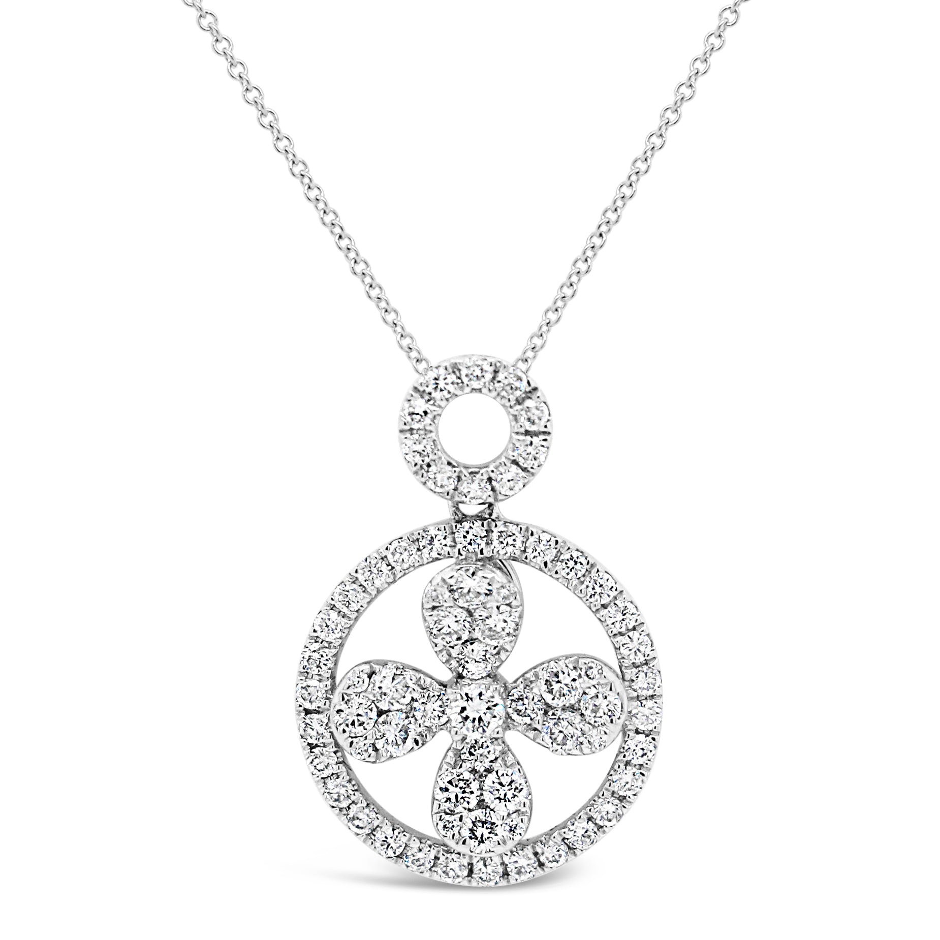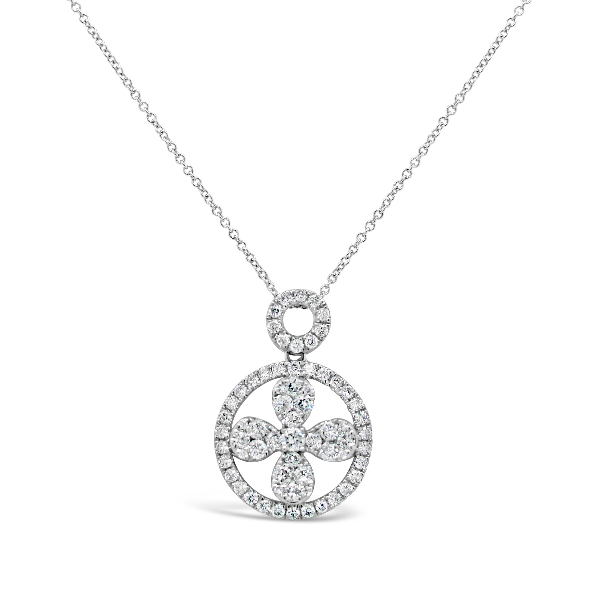 Crafted of 18 karat white gold, this gorgeous and unique pendant features a floral shape in the center of a round diamond lined circle with circular bale. The pendant weighs 5/8 carats TDW of round-cut diamonds. The uniquely shaped pendant rests on an angle and slides across a matching 18 karat white gold chain that measures 18 inches long with a lobster claw clasp. Each ethically mined diamond is hand selected to fit this pendant creating a unique one of a kind design.