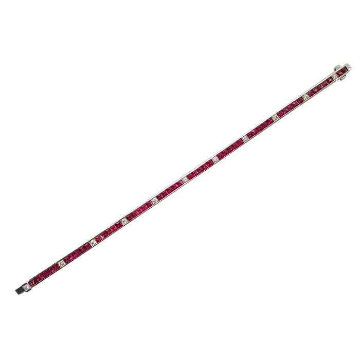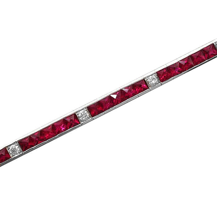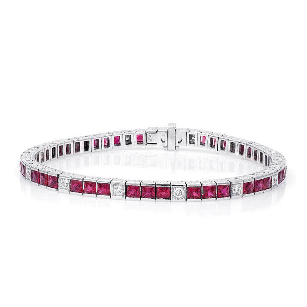 Studded with deep red, princess cut Rubies, this bracelet has a warm romantic touch to it. Crafted in 18K white gold, the color of the gold allows each gem to stand out. Set with diamonds at regular intervals, the bracelet has an added sparkle. Each natural ruby that has been cut to perfection together amounts to 6.76 carats. Filled with a color that ignites the feeling of passion and love, the humble crimson colored ruby is a great present to celebrate an occasion like an anniversary.