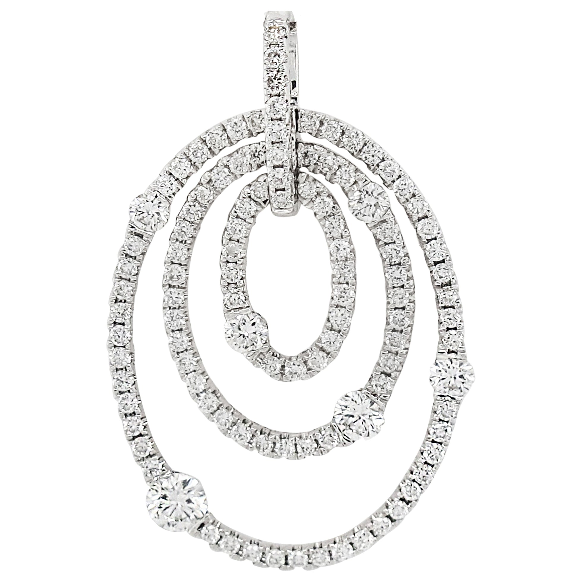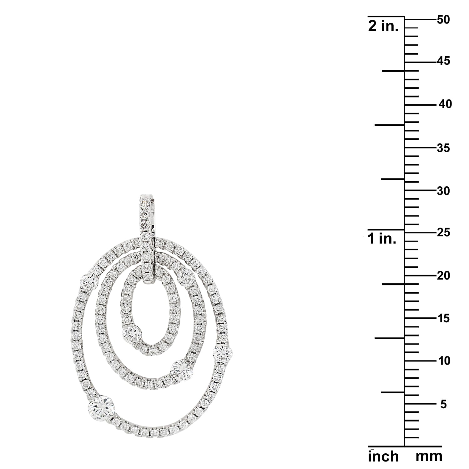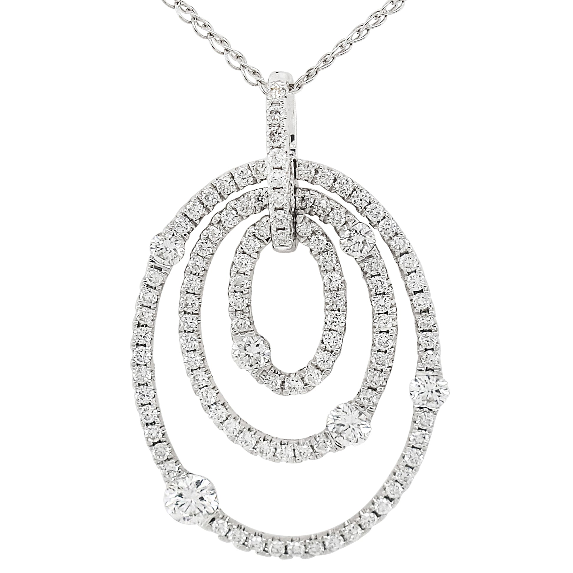 Three concentric ovals lined with 7/8 carat TDW pave-set round-cut white diamonds lining each make up this gorgeous pendant. A single larger diamond decorates each oval in an asymmetrical way. Connected in the center at the top with a diamond accentuated bail, this 18-karat white gold necklace is sure to delight and dazzle whoever wears it. Each ethically mined diamond is hand selected to fit this pendant creating a unique one of a kind design. The pendant suspends from a 16 inch chain with a 2 inch extension and secures with a lobster claw clasp.