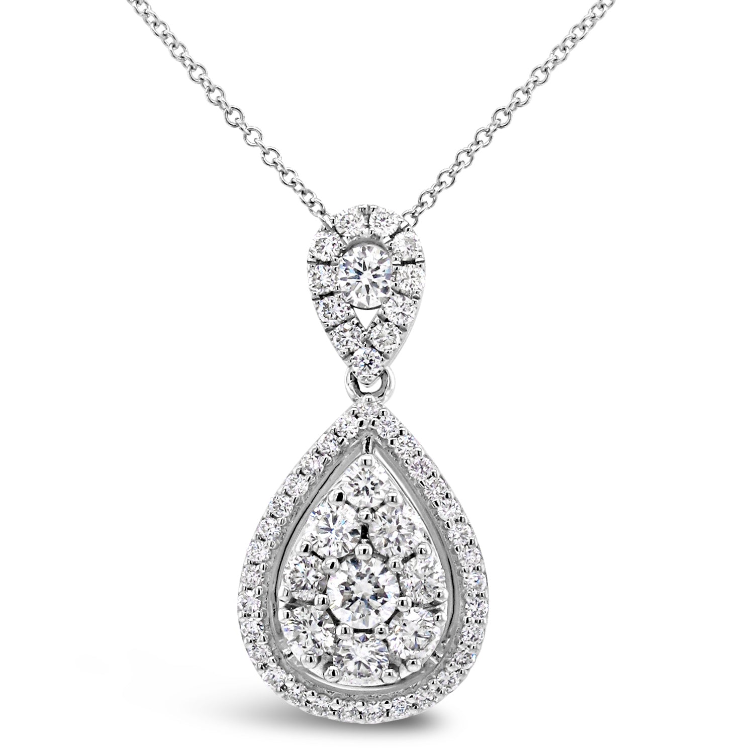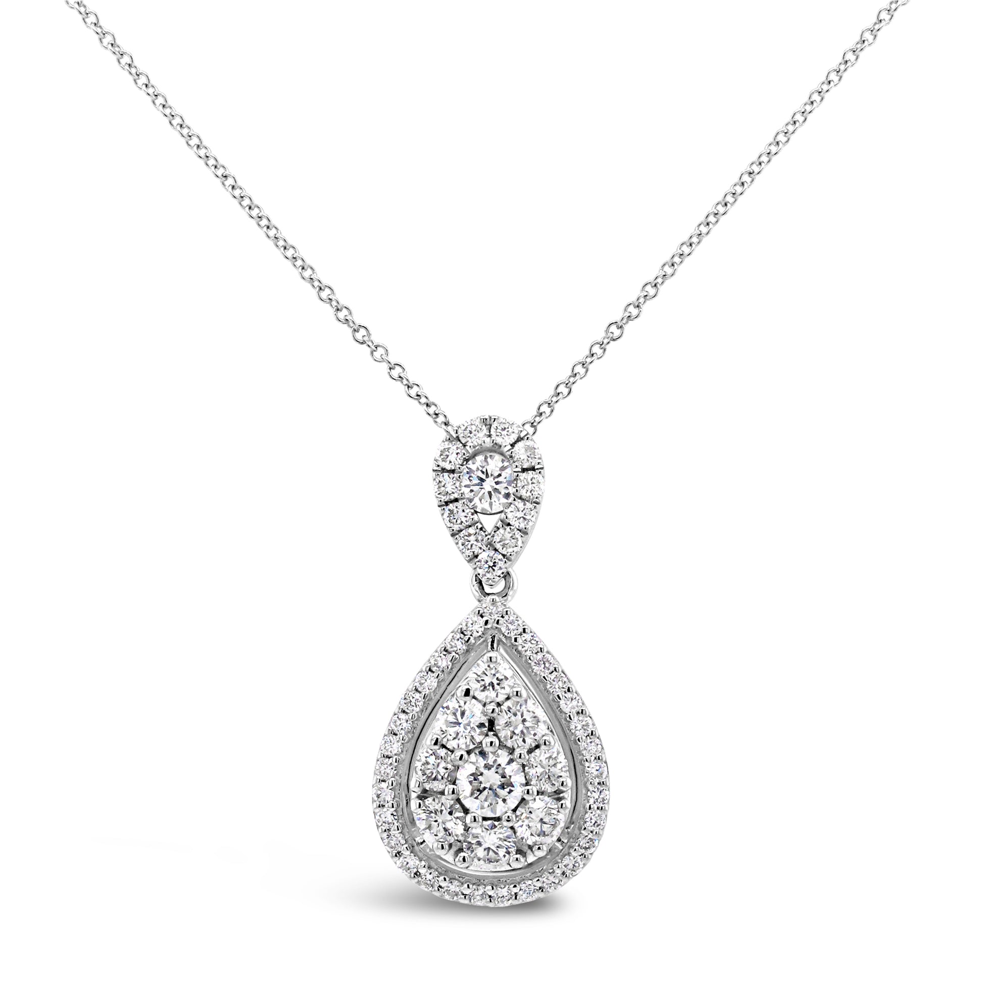 This elegant pear-shaped pendant features a cluster of round-cut white diamonds with a halo of diamond encircling the entire pendant. The bail is an inverted pair shape lined with white diamonds. The pendant weighs 0.90 carats TDW. The uniquely shaped pendant rests on an angle and slides across a matching 18 karat white gold chain that measures 18 inches long with a lobster claw clasp. Each ethically mined diamond is hand selected to fit this pendant creating a unique one of a kind design.
