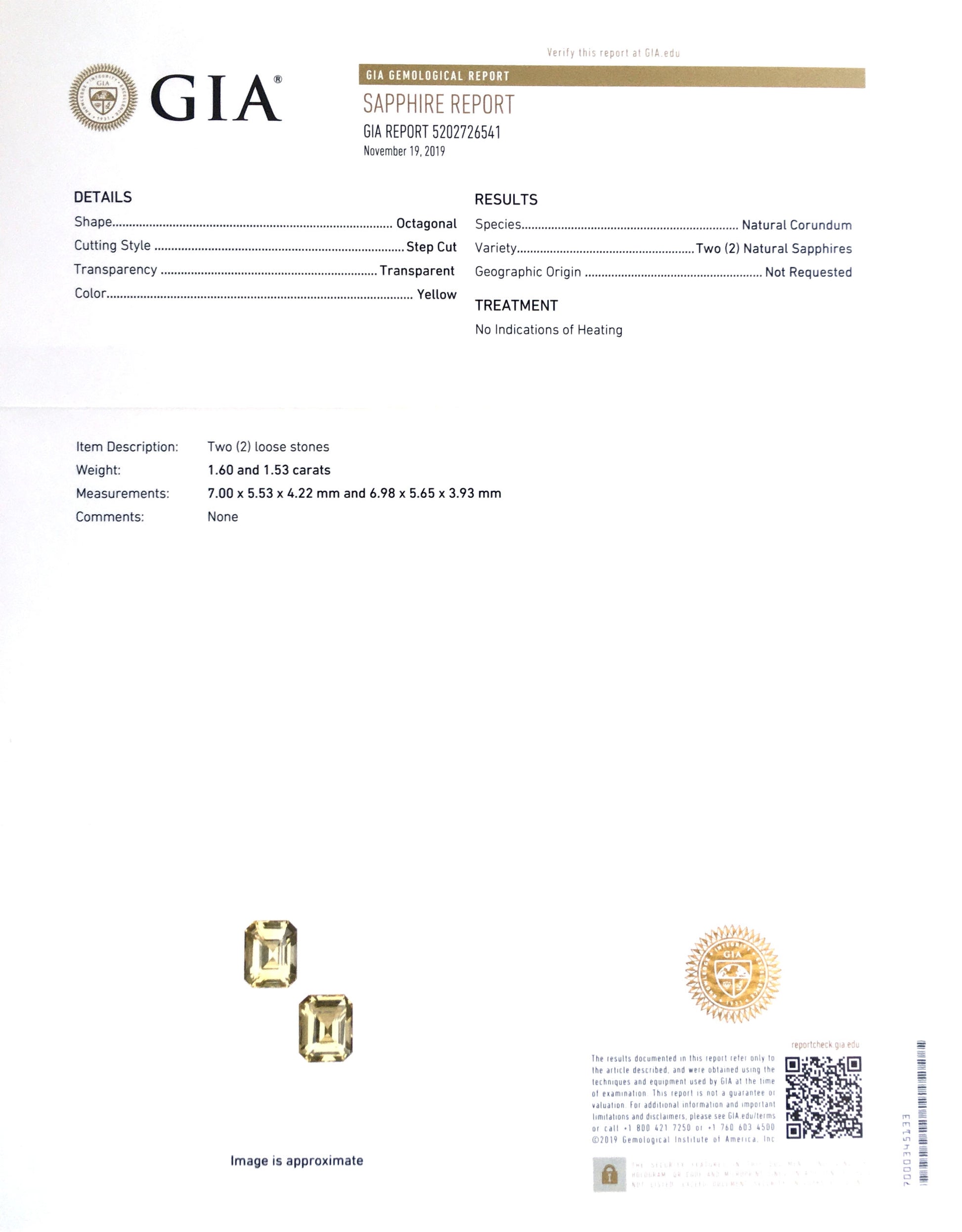 Natural Octagonal-shape 3.13ct TGW Matching Pair Yellow Sapphire - GIA Certified