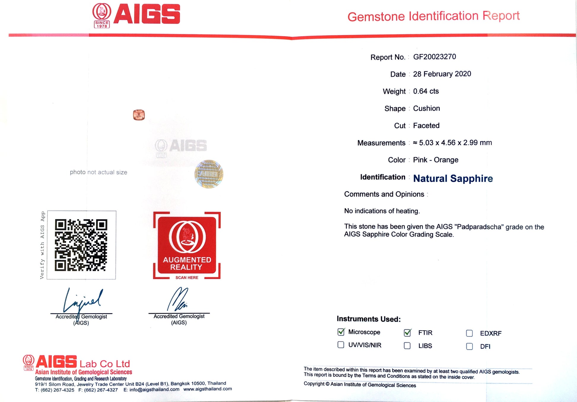 Natural Cushion-shape 0.64 carat Pink-Orange Padparadscha Sapphire - AIGS Certified